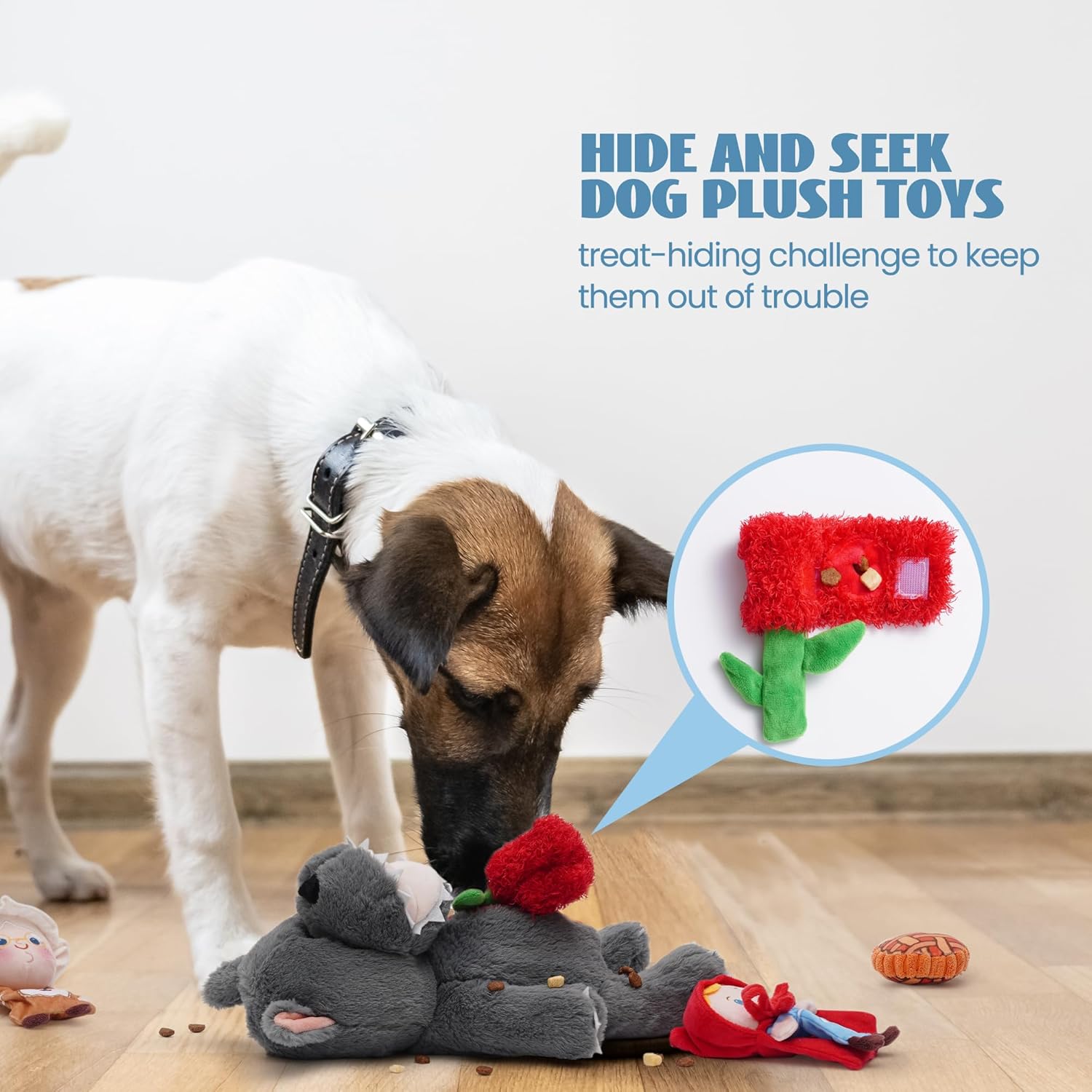 - 【6 in 1 Plüsch-Hundespielzeug-Set】 Enthält sechs Märchen-Hundespielzeuge aus der Geschichte des Rotkäppchens, jedes Hundespielzeug verfügt über einzigartige Elemente wie Knistern, Quietschen und Verstecken, alles in einem grossen Hundespielzeug
