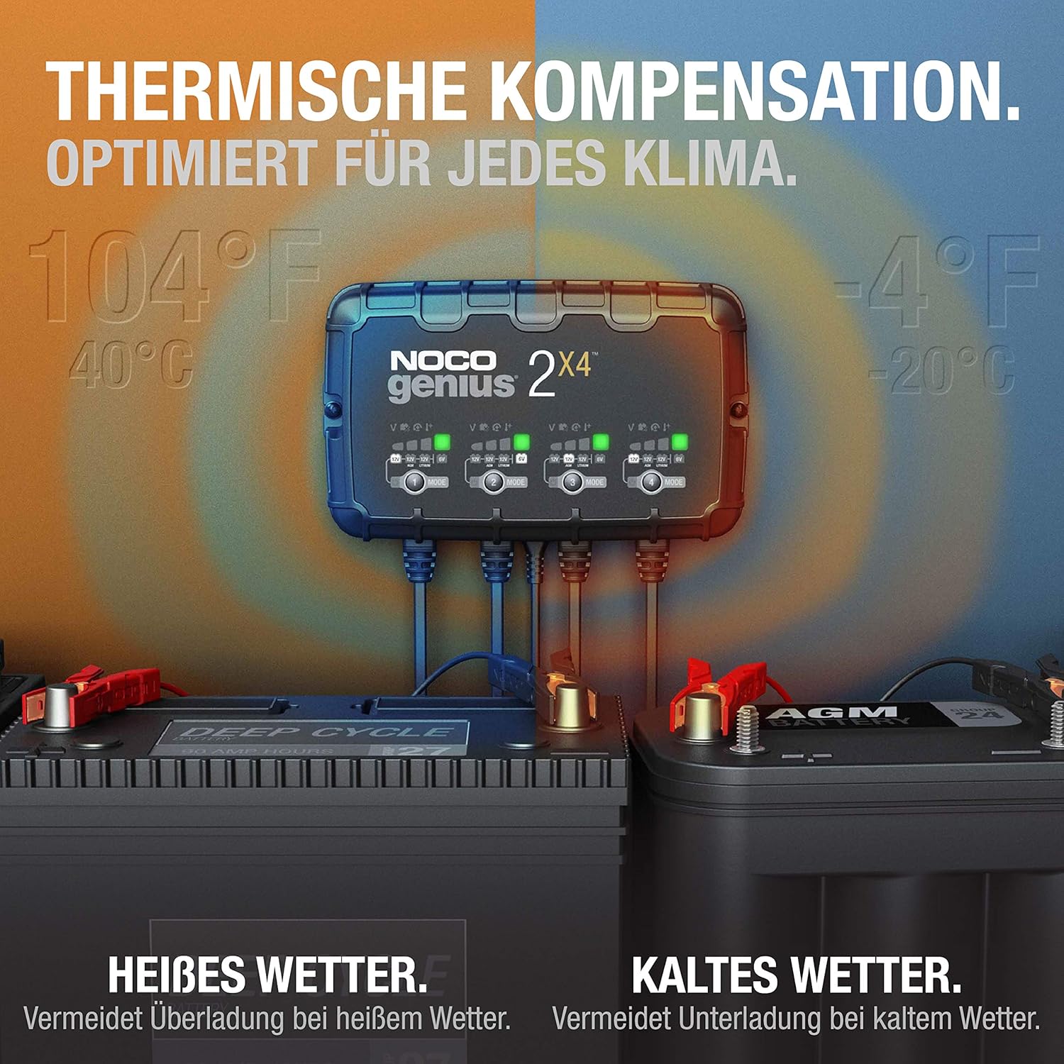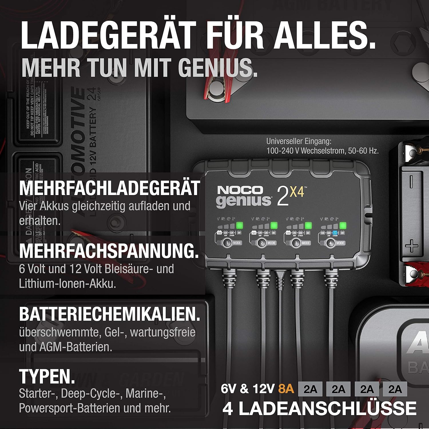 - LERNEN SIE DEN GENIUS2X4 KENNEN – Ein Vier-Banken-Batterieladegerät zum Laden mehrerer Batterien. Es ist die universelle All-in-One-Lösung für das gleichzeitige Laden von vier Batterien: Batterieladegerät, Batterieerhaltungsgerät, Batteriepfleger