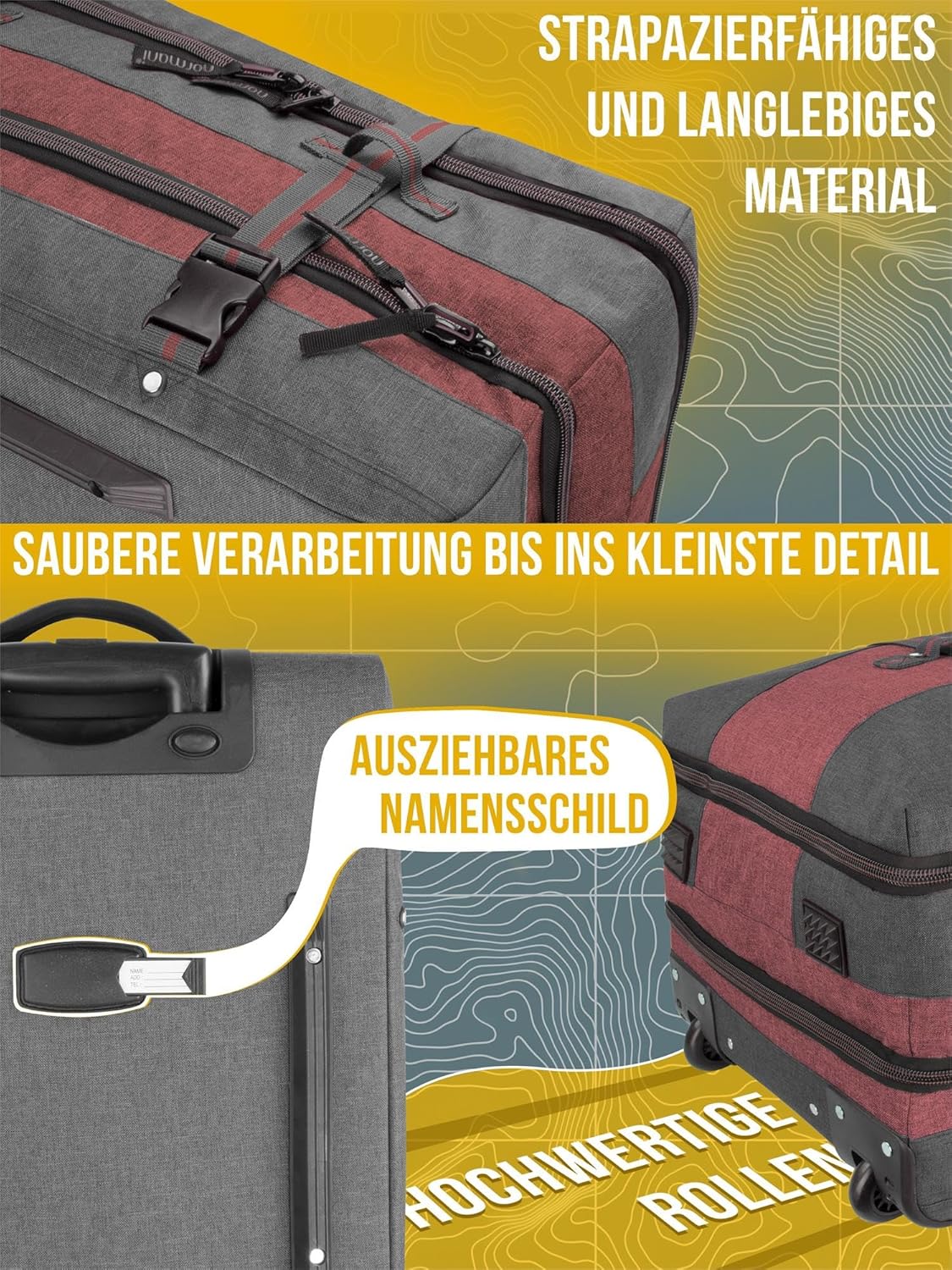 - Leichte und stabile Reisetaschemit 45 Liter Volumen verteilt auf 3 grosse Fächer