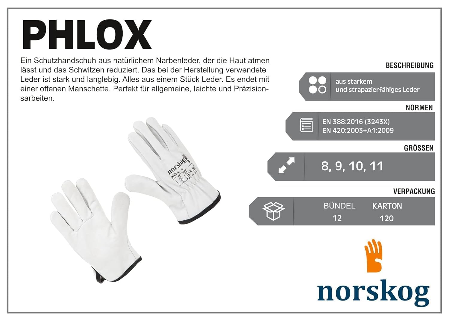 - Handschuh in Übereinstimmung mit der Norm: EN 388, 420 (3243X).