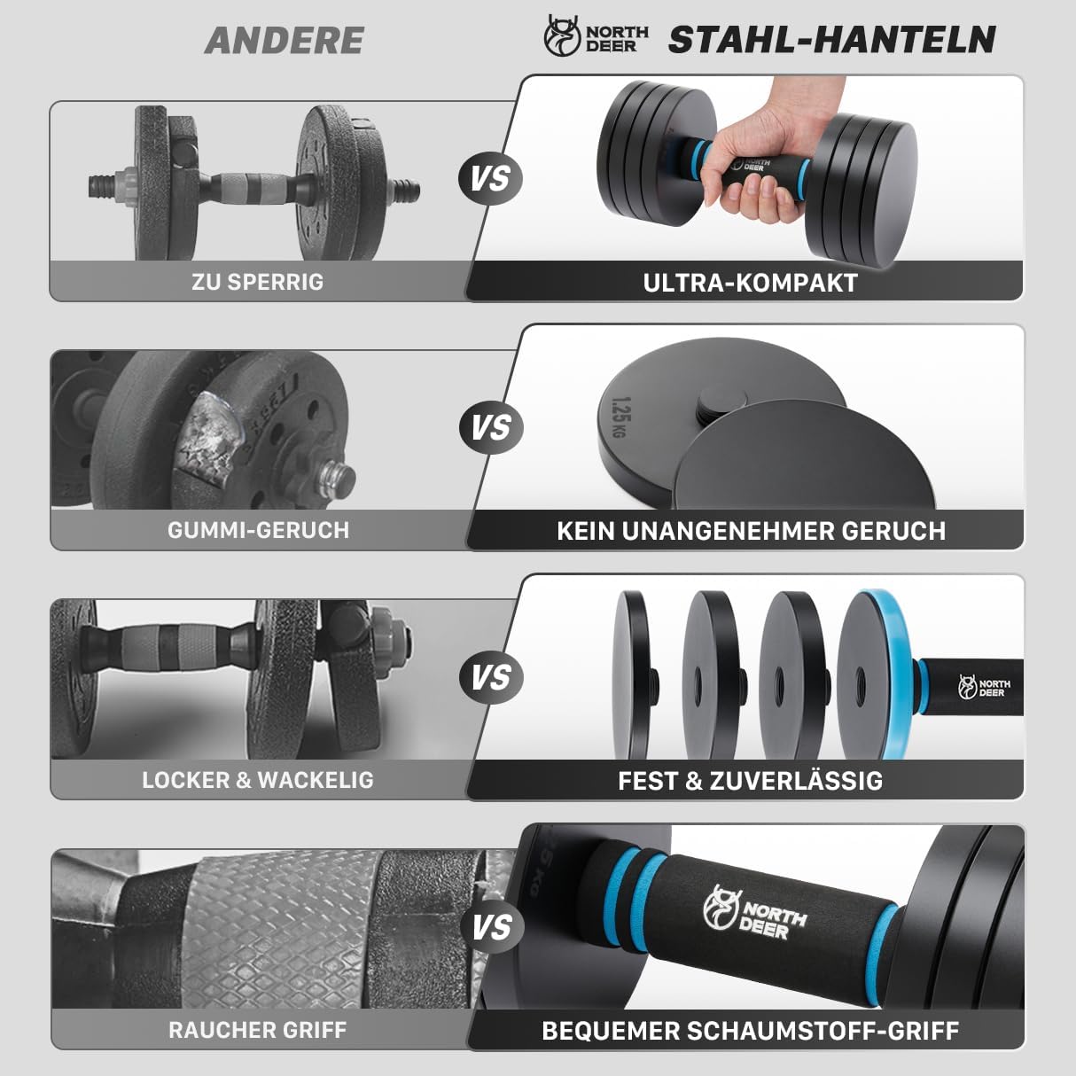 - ULTRAKOMPAKT & SICHER: Die neue Generation der Northdeer verstellbaren Hanteln ist die perfekte Kombination aus Robustheit und Platzersparnis. Hergestellt aus massivem Stahl, sagen sie Auf Wiedersehen zu sperrigen traditionellen Hanteln. Egal, ob du
