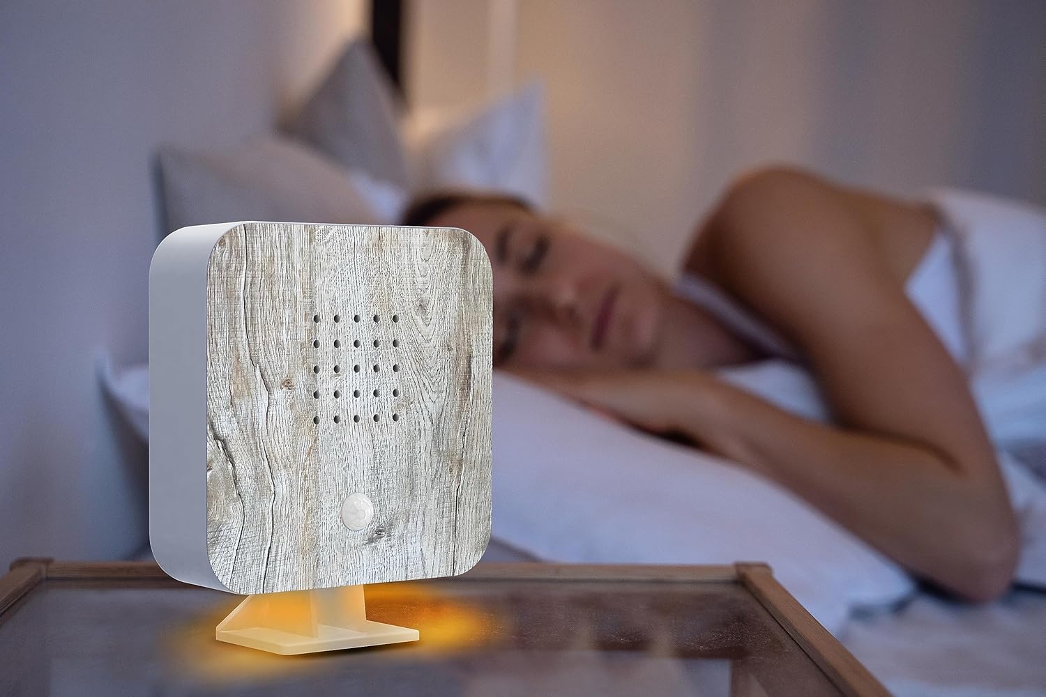 - Die Klangauswahl von 9 verschiedenen Naturgeräuschen und die Einstellung der Timerfunktion erfolgt über zwei Touch-Tasten auf der Oberseite.