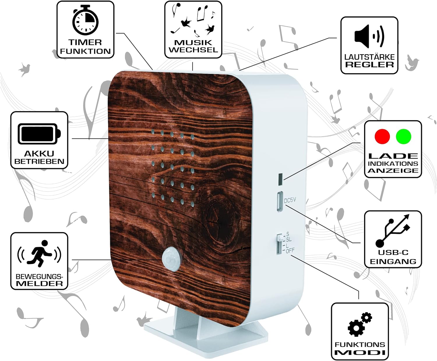 - Lieferumfang: Naturgeräuschbox im jeweiligen Design mit abnehmbaren Standfuss, 2x Saugnäpfe zur Wandmontage, Dübel und Schraube, USB-C Ladekabel und deutsche Bedienungsanleitung