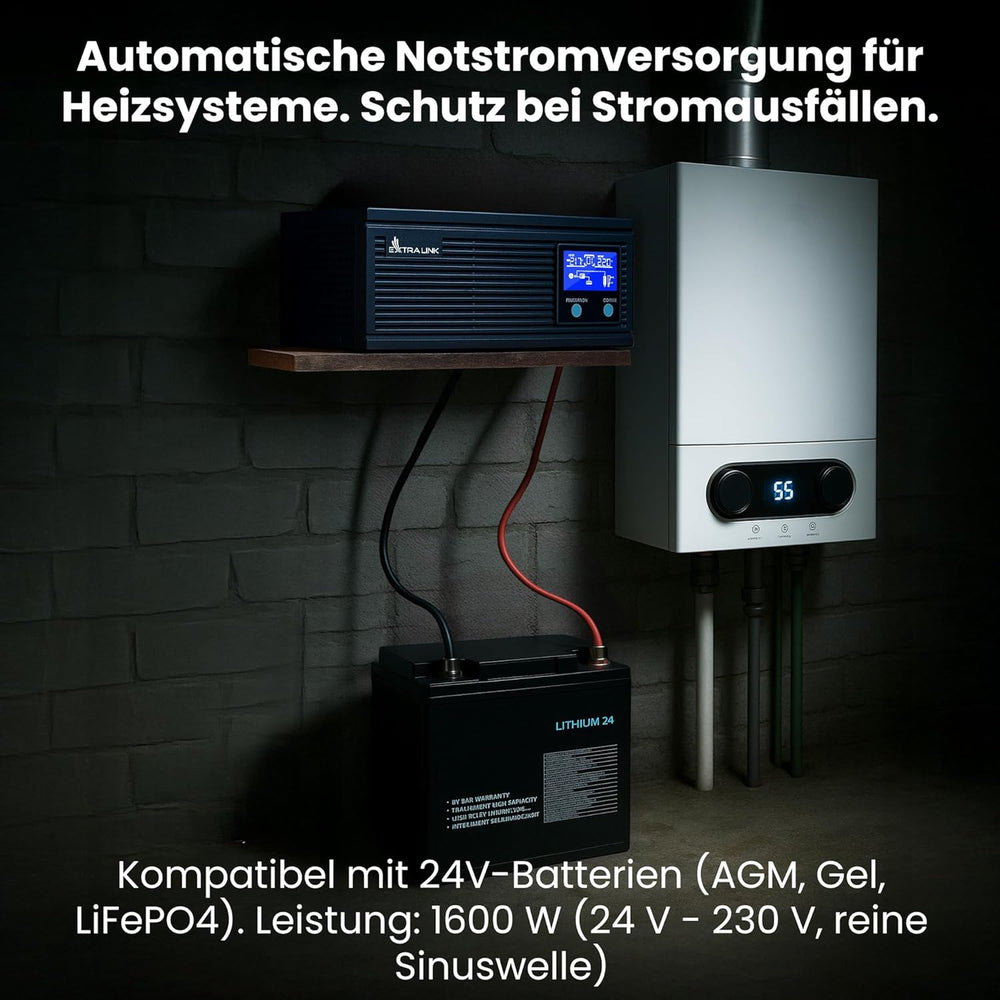- Unser Extralink Wechselrichter mit Netzvorrangschaltung überzeugt mit schneller Schaltzeit, mehrfachem Schutz und reiner Sinuswelle. Ideal für empfindliche Geräte wie Laptops, Öfen und medizinische Geräte.