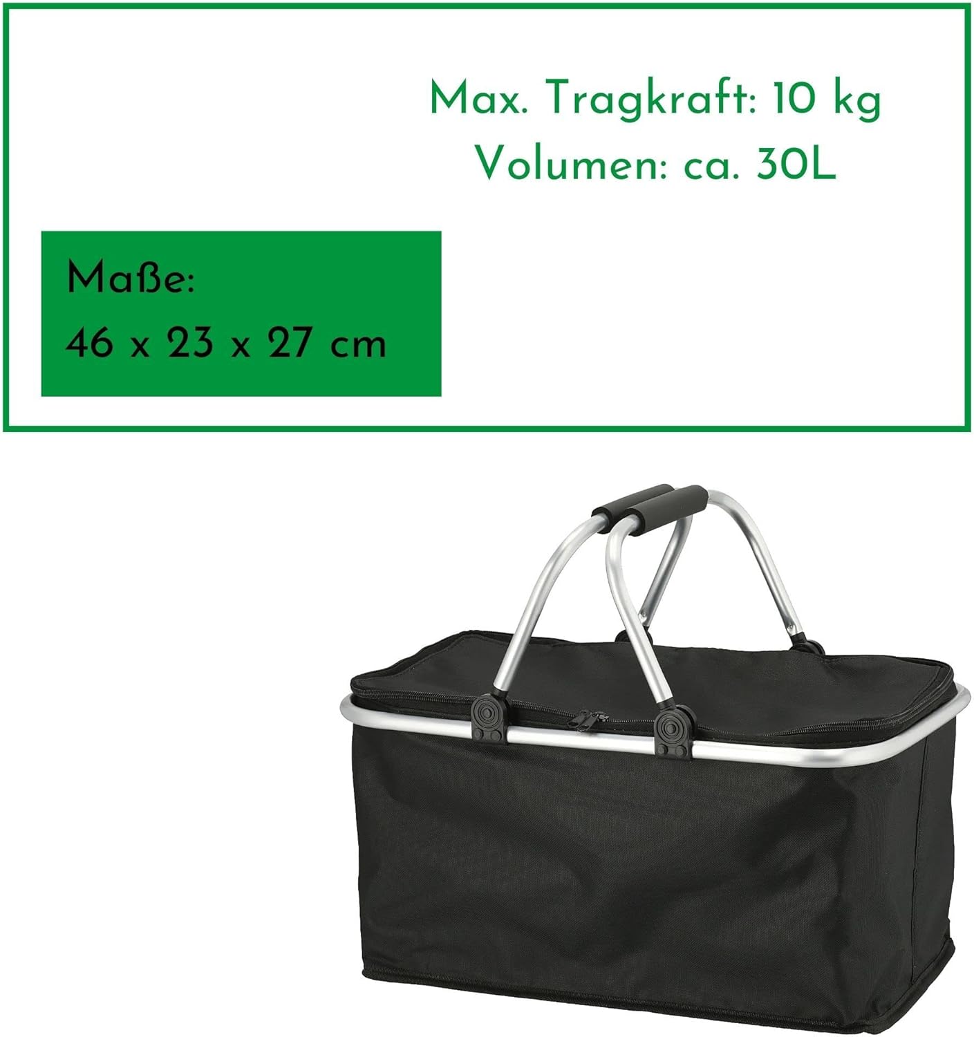 - ZEITLOS: Der Einkaufskorb mit Deckel ist in der Farbe schwarz und hat folgende Masse: 46 x 23 x 27 cm. Die Grösse eignet sich ideal für kleine bis grosse Einkäufe. Tragkraft maximal 10 kg.