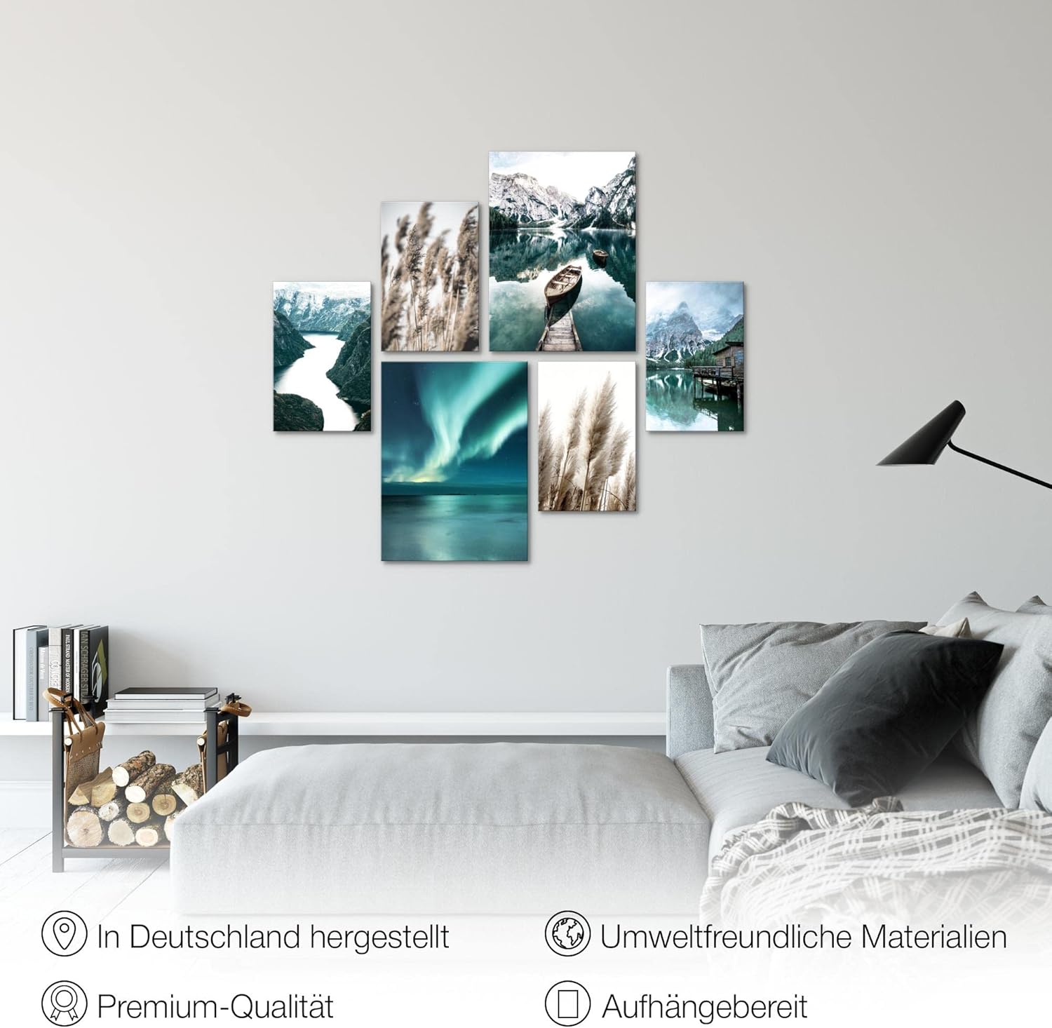 Novart Bilder Set - AUFHÄNGFERTIG - KEIN EXTRA RAHMEN BENÖTIGT - Natur Berge See Modern Aurora Grün