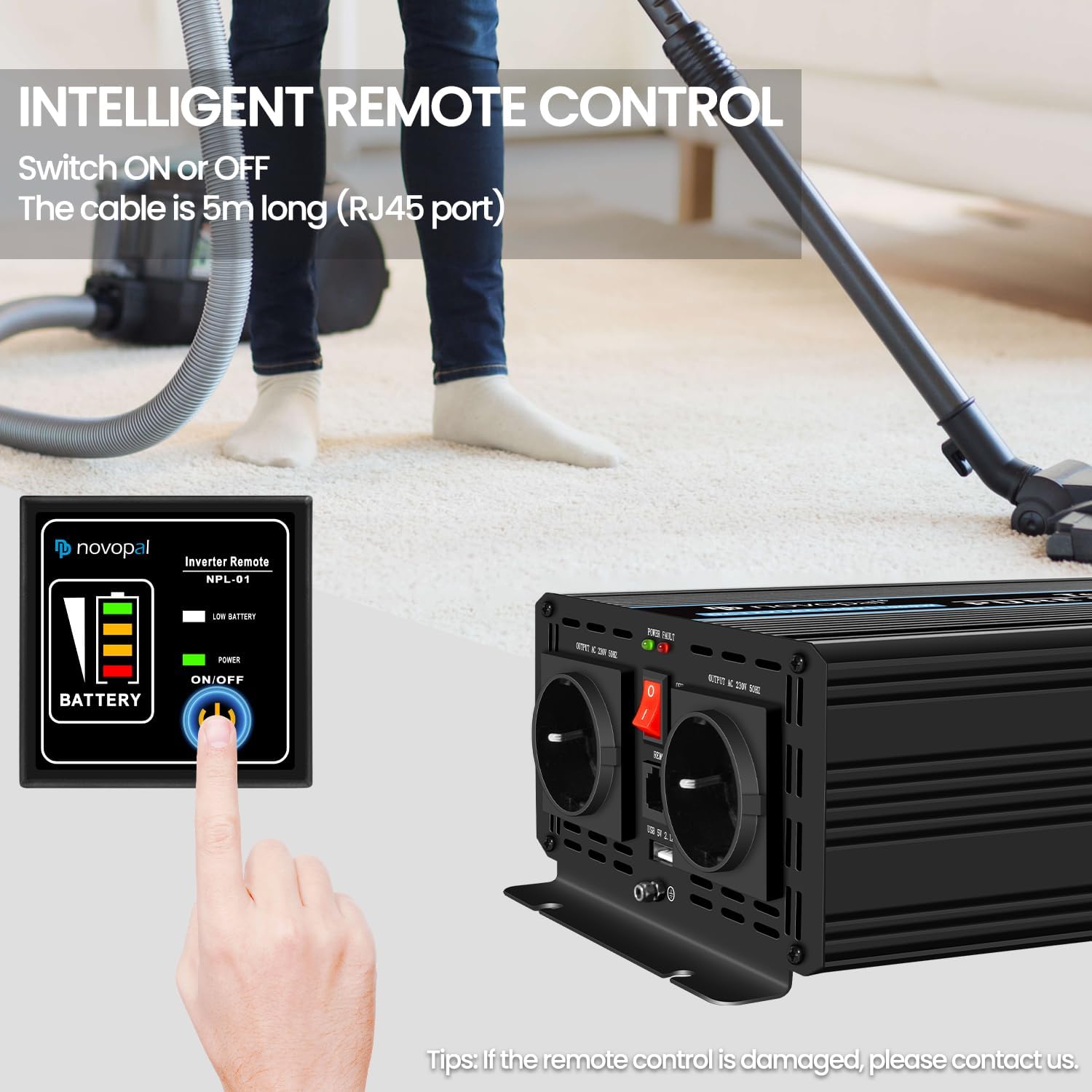 • 🔝🔝【5M Fernbedienung】Der Wechselrichter 1000W ist mit 5 m langen Kabelfernbedienung mit DC-Batterieanzeige ausgestattet, Sie können Ihren 12v auf 230v Wechselrichter einfach aus der Ferne steuern und alle Leistungsparameter jederzeit einsehen.