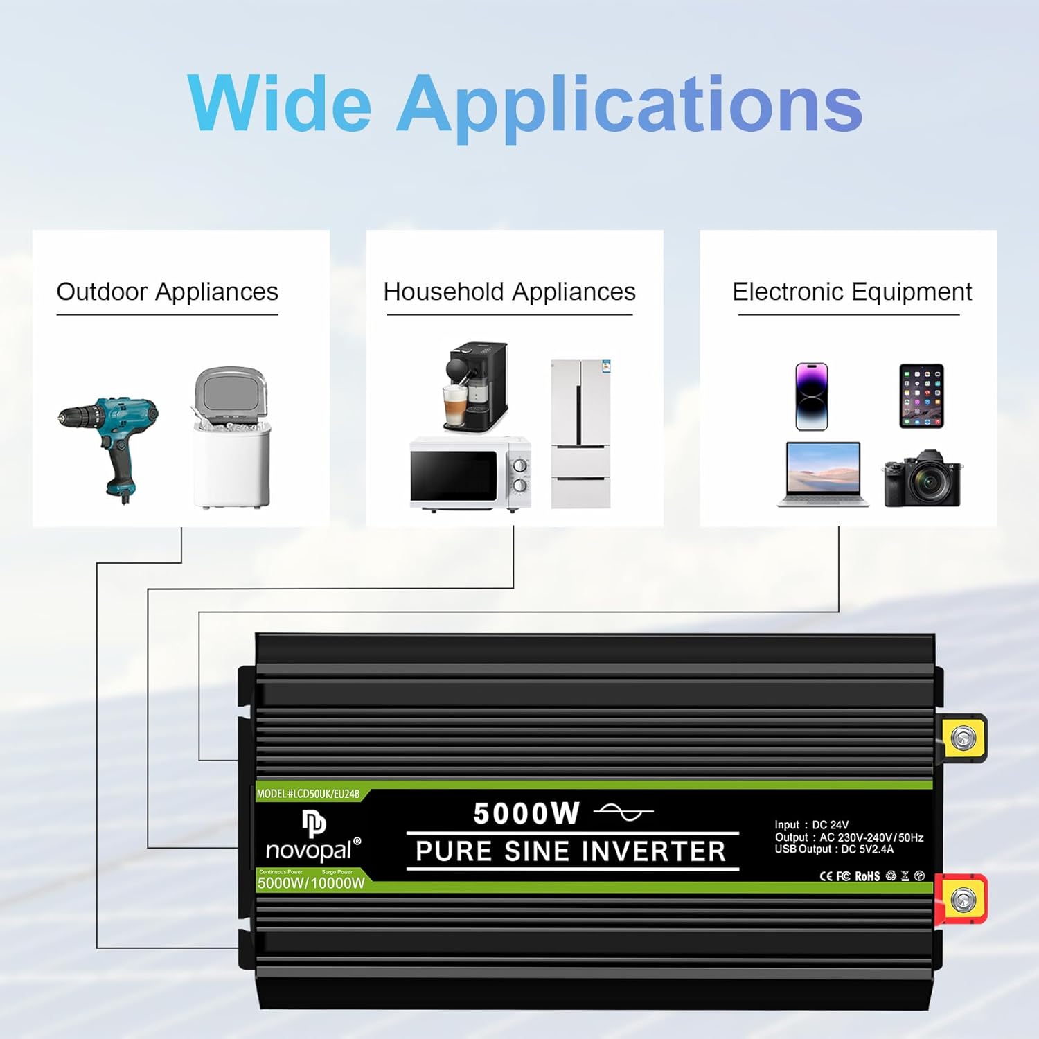 • 🚚🚚【5000W Reiner Sinus Wechselrichter】Wandelt 24V DC in höchste Qualität 230V AC um,Durch die Verwendung der SPWM-Technologie, die von einem MCU-Mikroprozessor gesteuert wird, sorgt die hervorragende Sinuswelle dafür, dass der