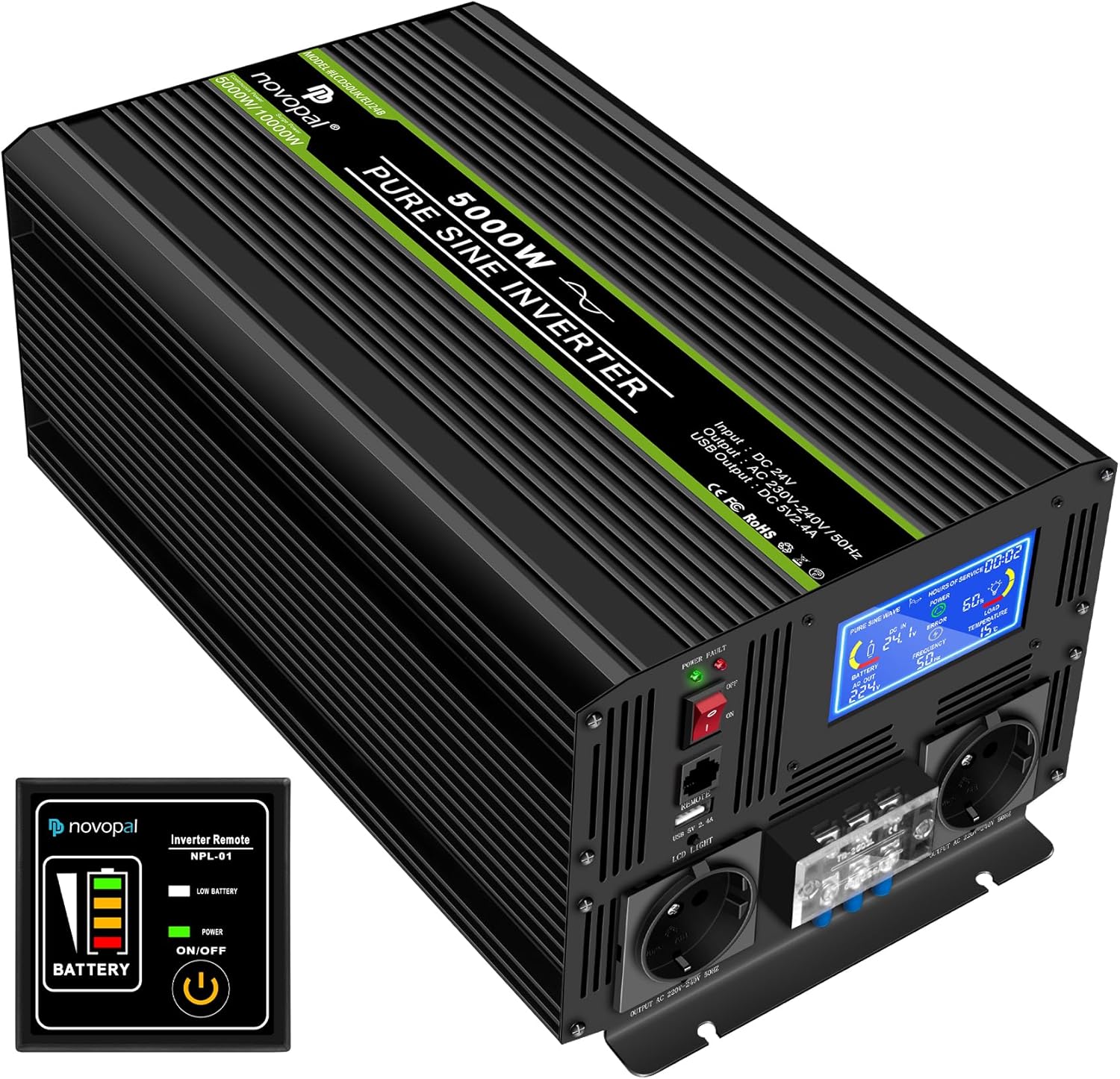 NOVOPAL 5000W KFZ Reiner Sinus Wechselrichter Spannungswandler 24V 230V mit LCD Display und 2 EU Ste