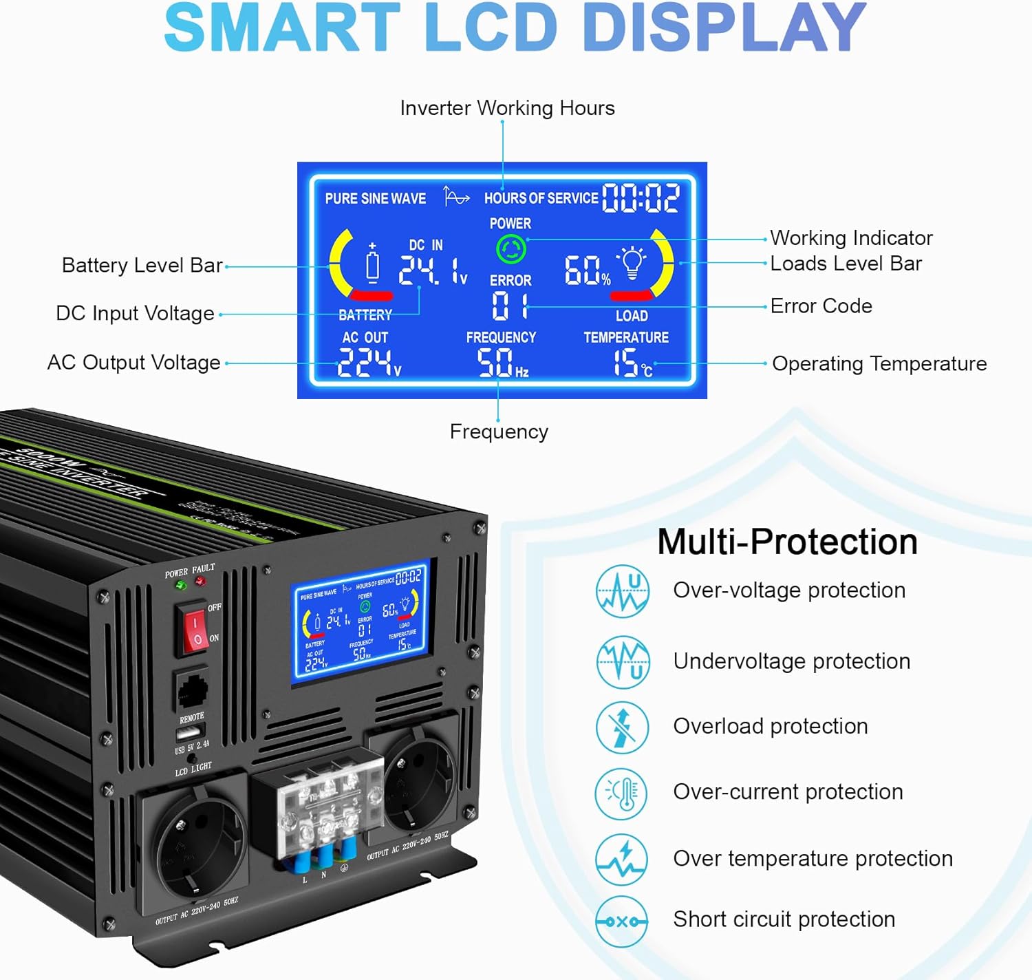 • 🚚🚚【5-Meter-Fernbedienung】Der Wechselrichter 5000w Reiner Sinus Bereitstellung von 5m langen Kabelfernbedienung mit DC-Batterieanzeige ausgestattet, Sie können Ihren 24V auf 230v spannungswandlermit einfach fernsteuern und alle