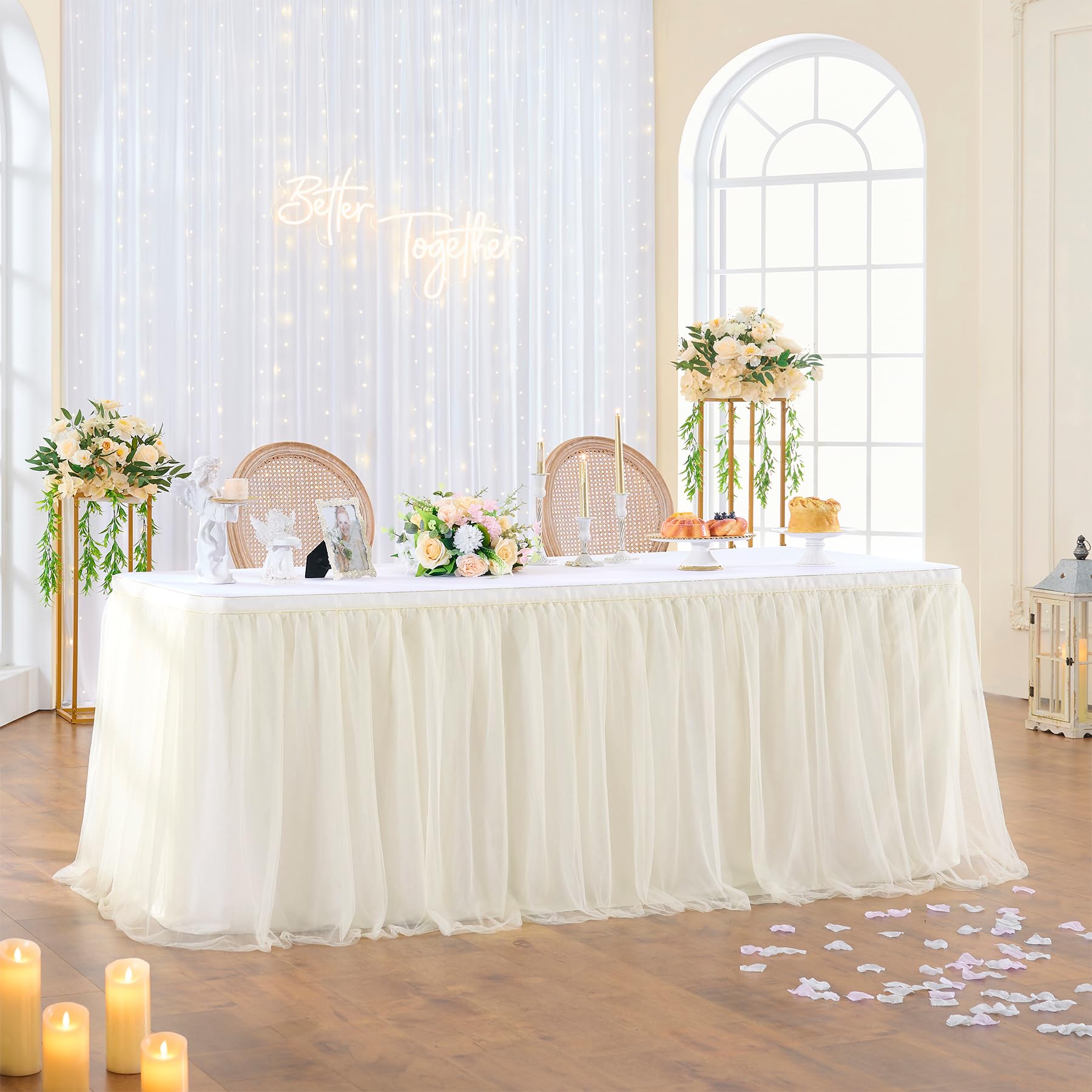 - 【Soft Pleated Wavy Fluffy Tulle with Washable Lining Table Skirting】- The tulle tutu table skirt made of fluffy tulle with soft lining,double table skirts, very nicely finished with glittery ribbon thread at the top, making the cream tulle table