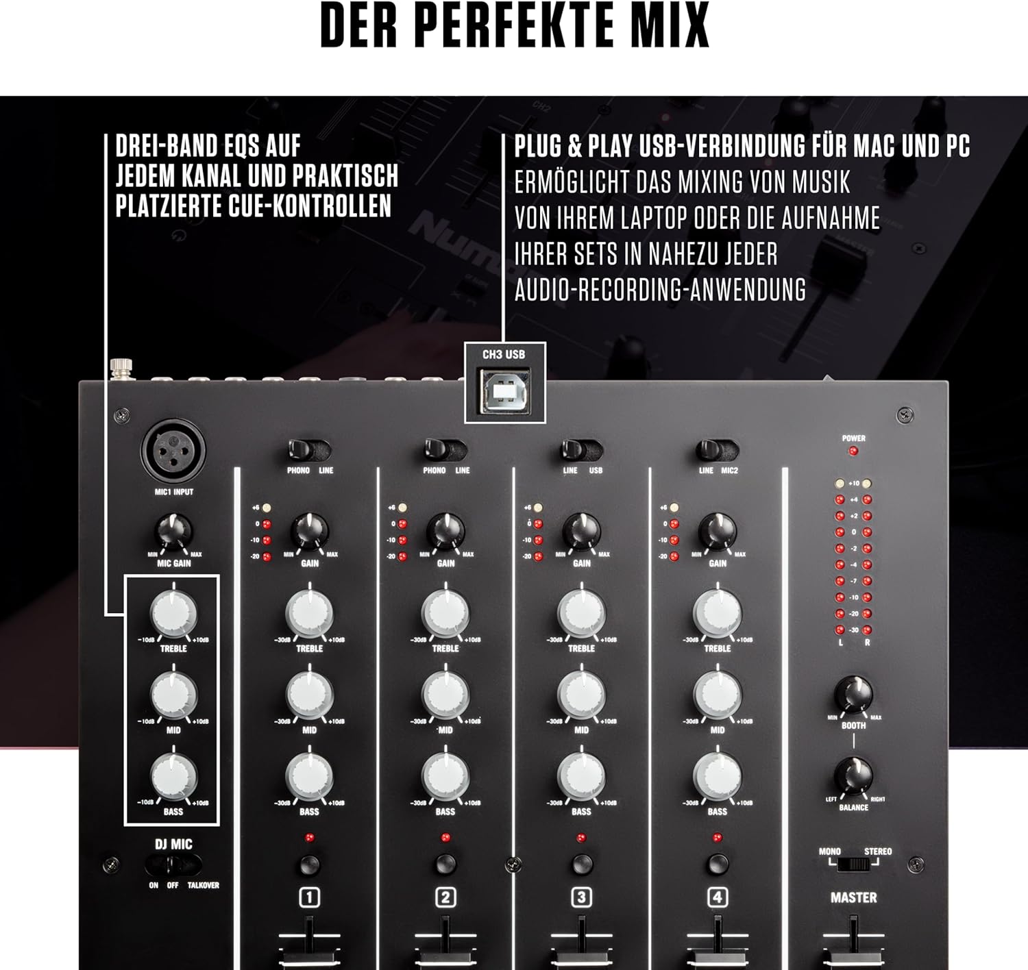 - Vielseitig, funktionsreich – Vier-Kanal DJ Mixer mit essenziellen Funktionen für jedes DJ-Szenario, von Hochzeiten über Clubs, Partys bis zu Trainings-Setups