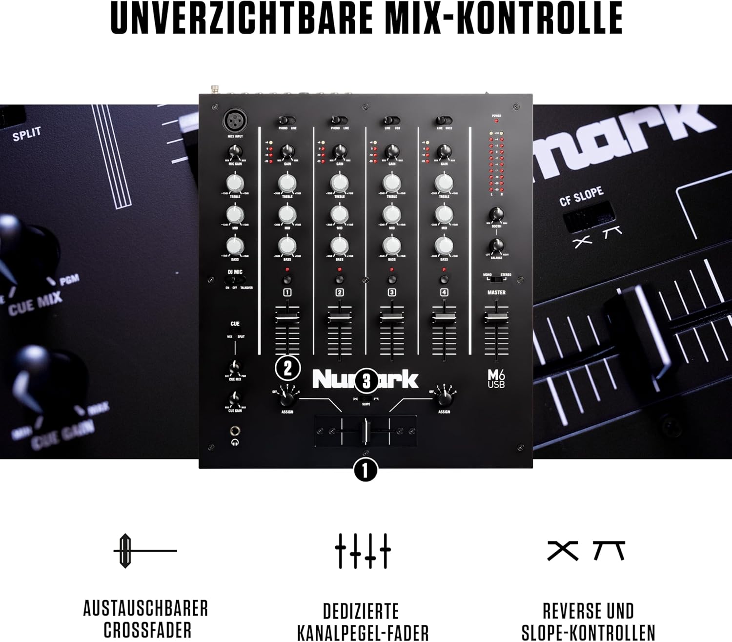 - Mix-Kontrolle - Vier Kanäle mit einem austauschbaren Crossfader, dedizierte Kanalpegel-Fader plus Slope-Kontrollen; Drei-Band EQs auf jedem Kanal und dedizierte Cue-Kontrollen