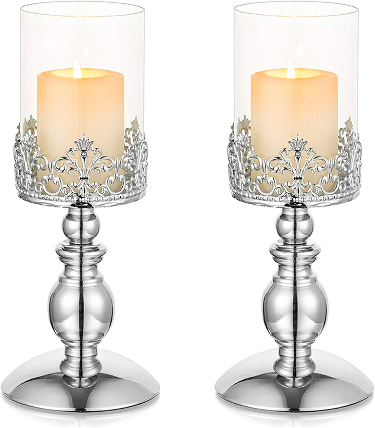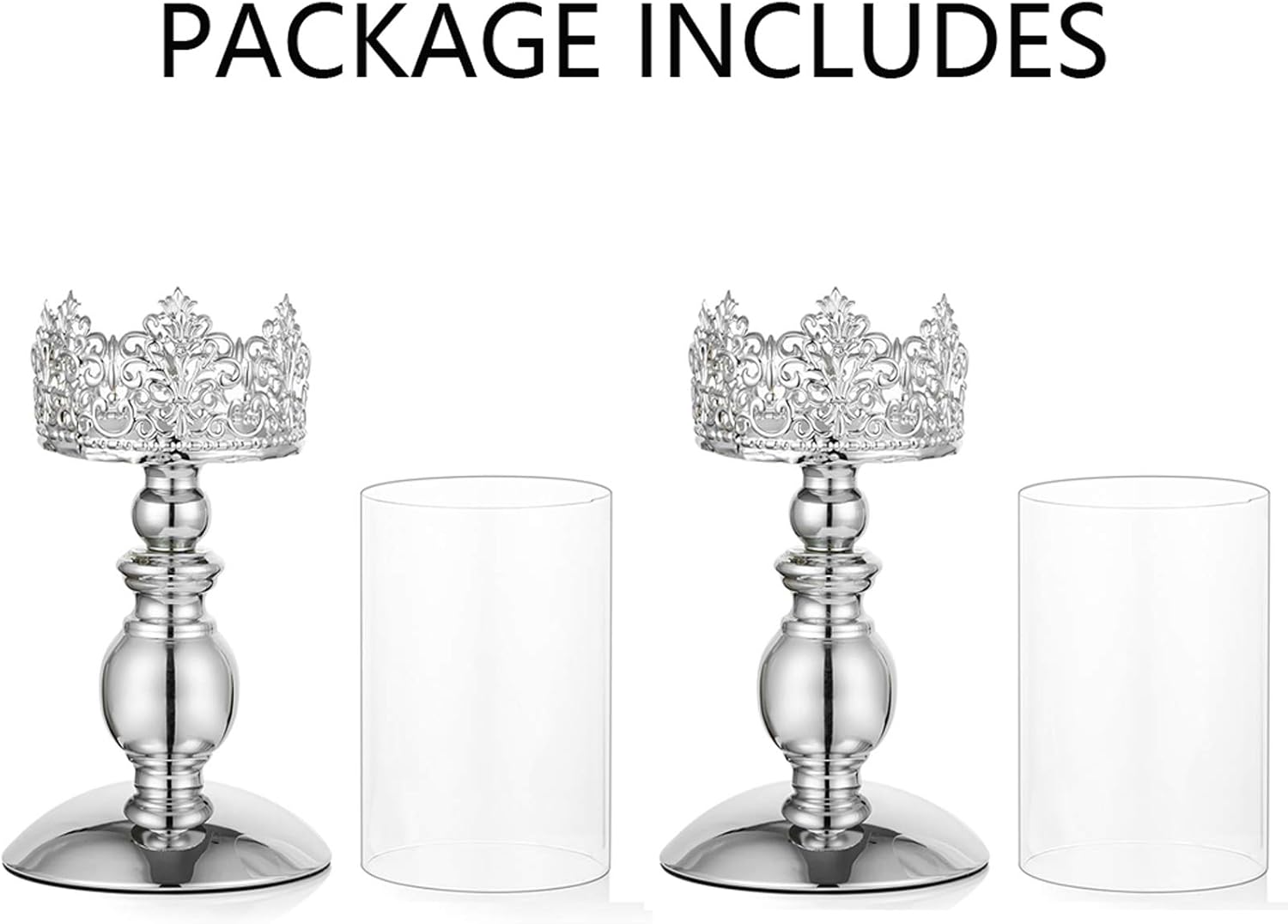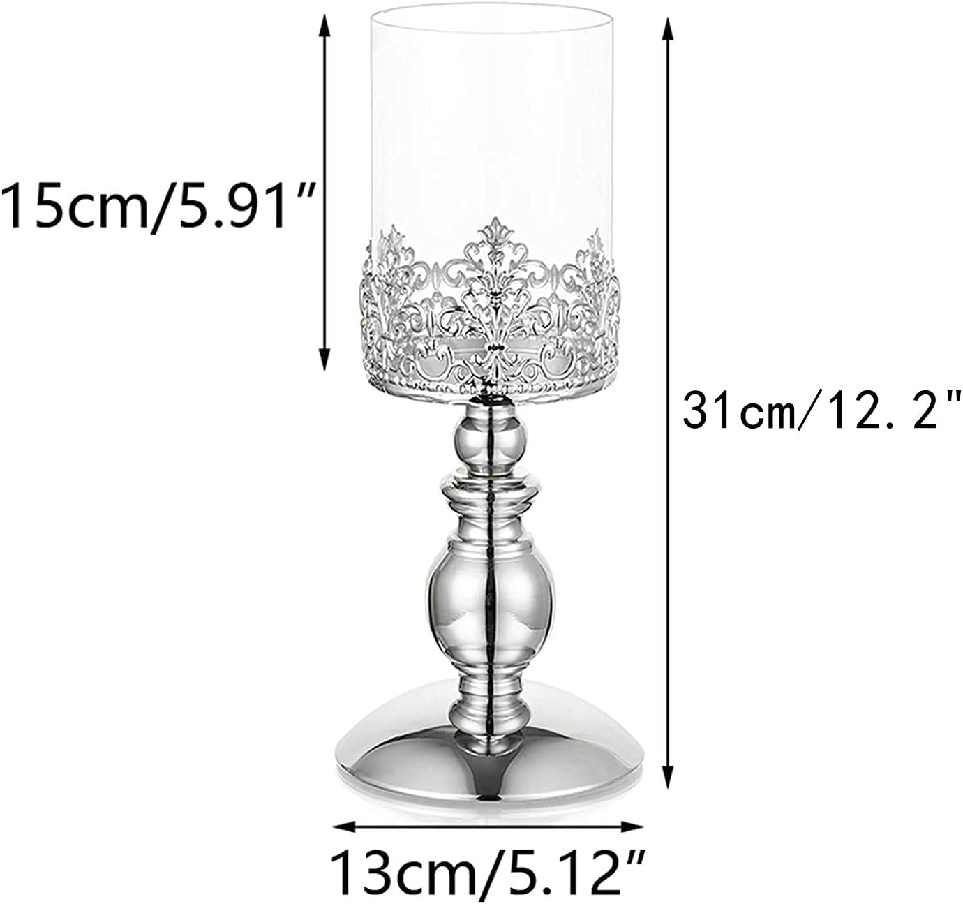 - ABMESSUNG: Die Höhe des silber Kerzenhalters beträgt 26cm/10.24", der Basisdurchmesser 13cm/5.12" und der obere Durchmesser 10cm/3.94". Die Höhe des Glases beträgt 15cm/5.91". Geeignet für Stumpenkerzen.