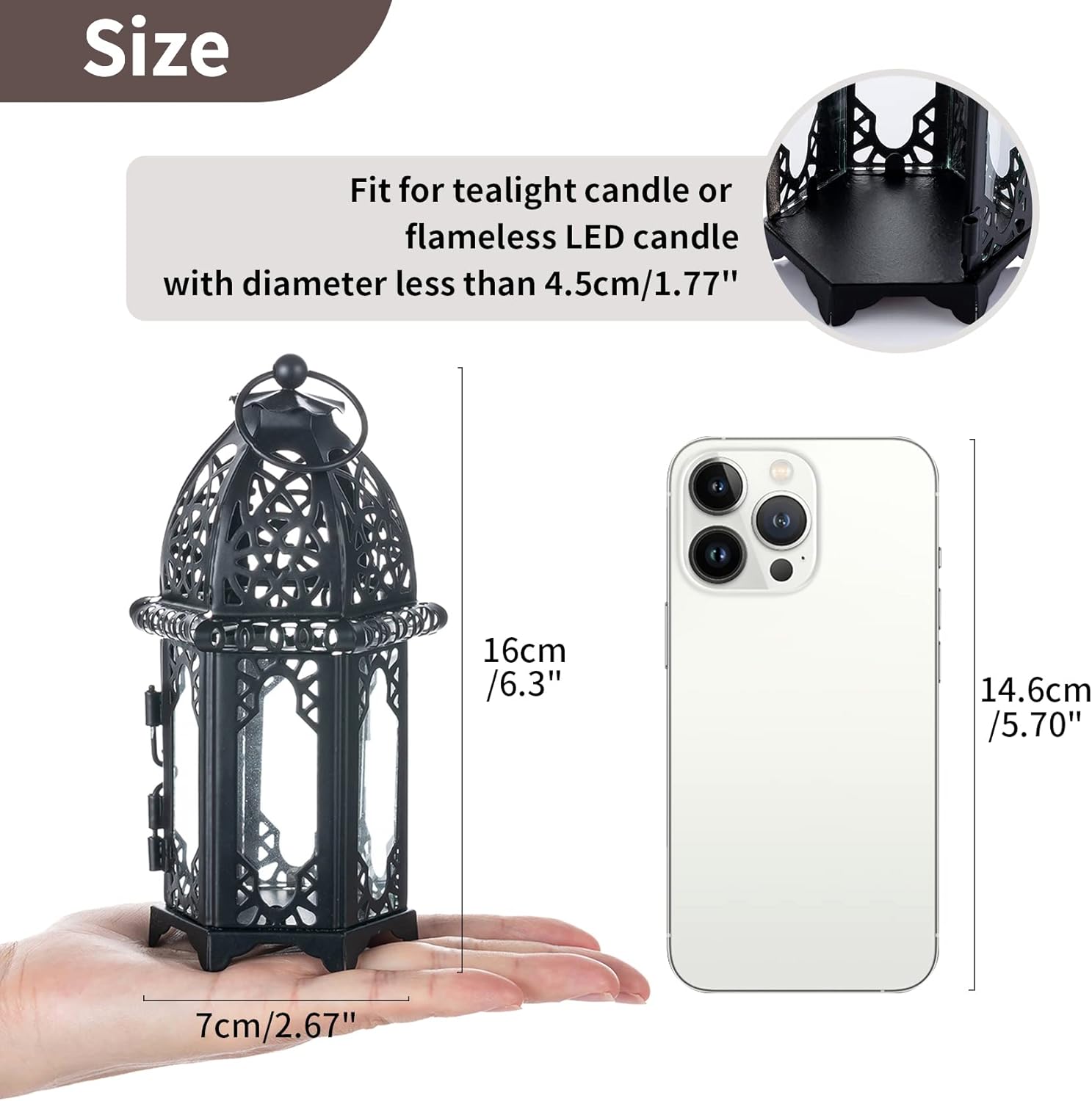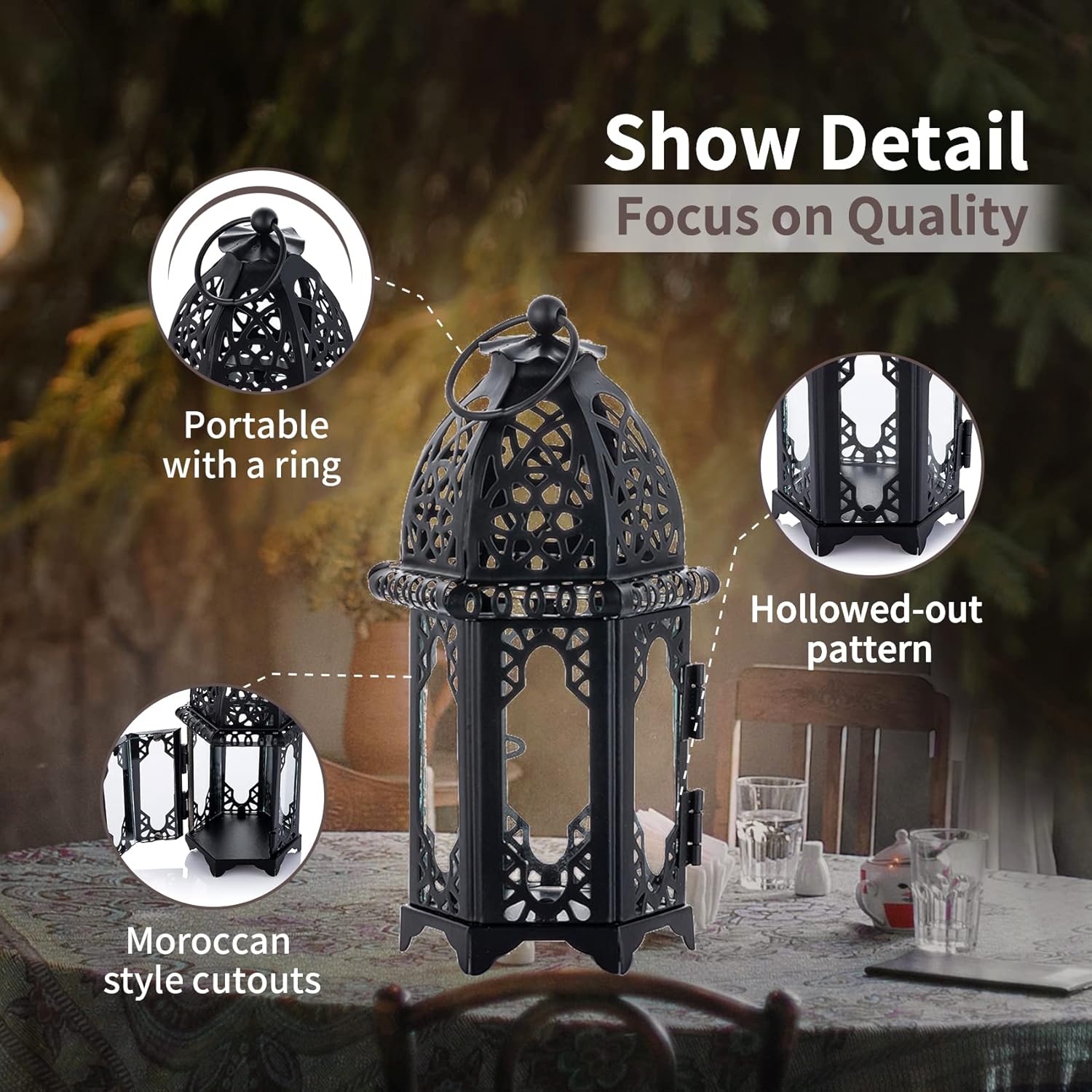 • Unsere Laterne wird mit einem stabilen Metallring zum einfachen Aufhängen geliefert. Die flache Basis ermöglicht das Aufstellen auf einer ebenen Fläche. Geeignet zum Aufhängen oder als freistehende Lampe.
