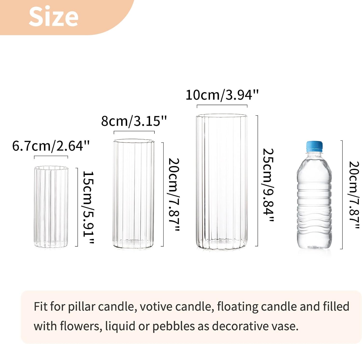 • Dimension: 3 verschiedene Grössen von Pampasgras Vase: Höhe: 15cm/20cm/25cm(5.91"/7.87"/9.84"). Durchmesser der Öffnung: 6.7cm/8cm/10cm(2.64"/3.15"/3.94"). Geeignet für Stumpenkerze, Votivkerze, Teelichtkerze, Schwimmkerze und gefüllt mit