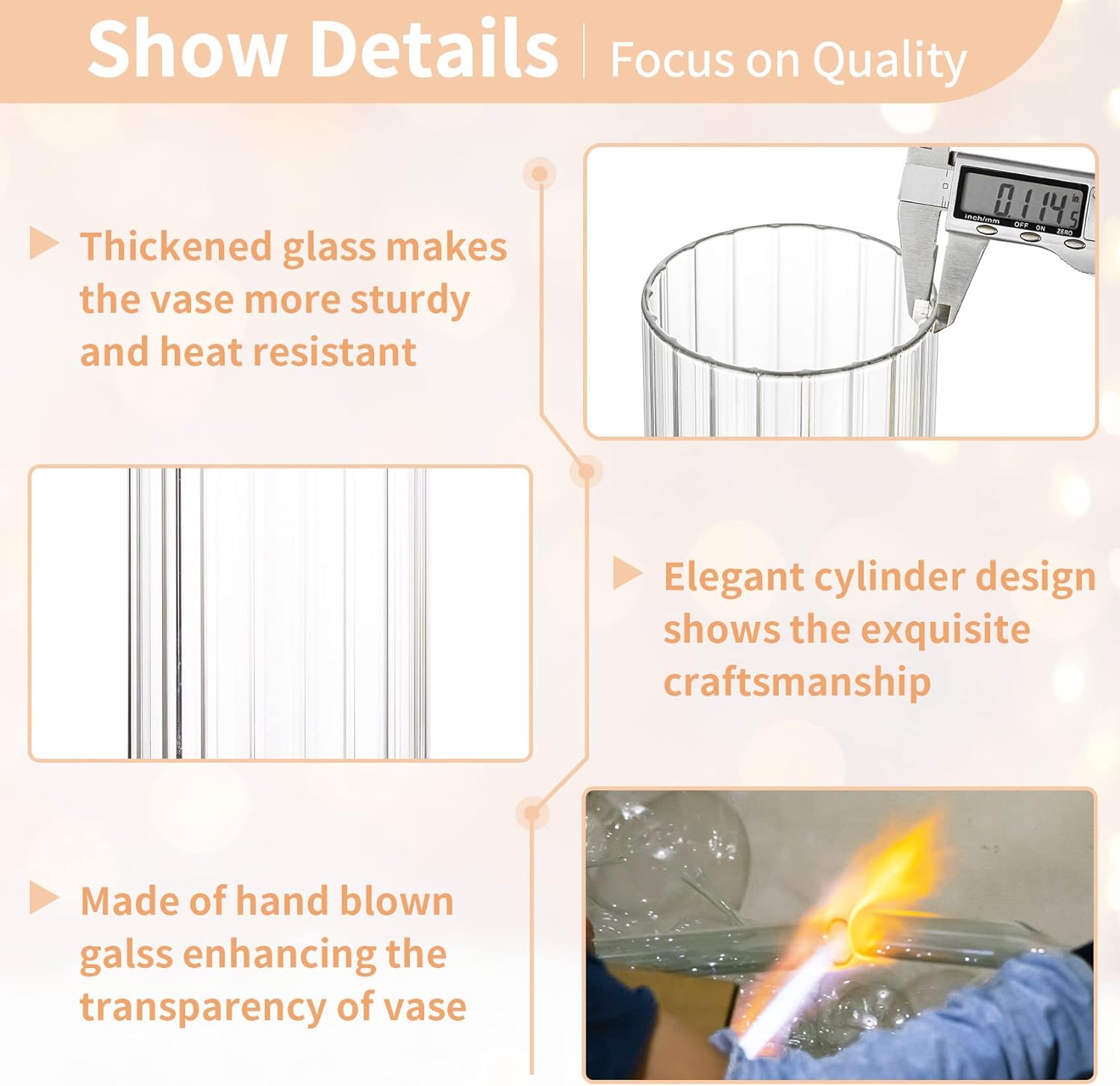 • Transparentes Geblasenes Glas: Glas Kerzenhalter ist aus hochwertigem Borosilikatglas, klar und dick, sieht eleganter und hitzebeständig. Die Dicke des Randes ist etwa 2.5-3mm.