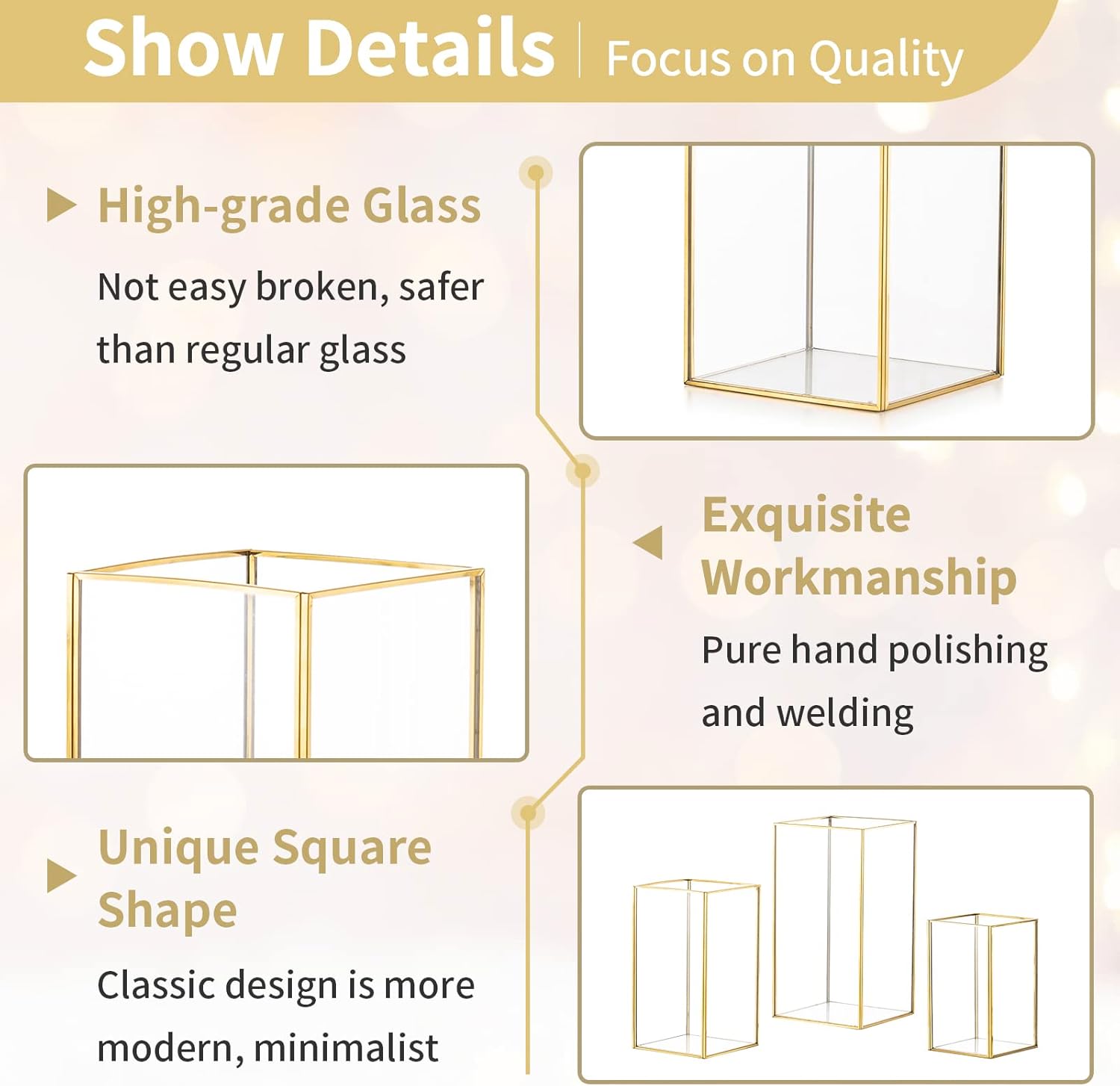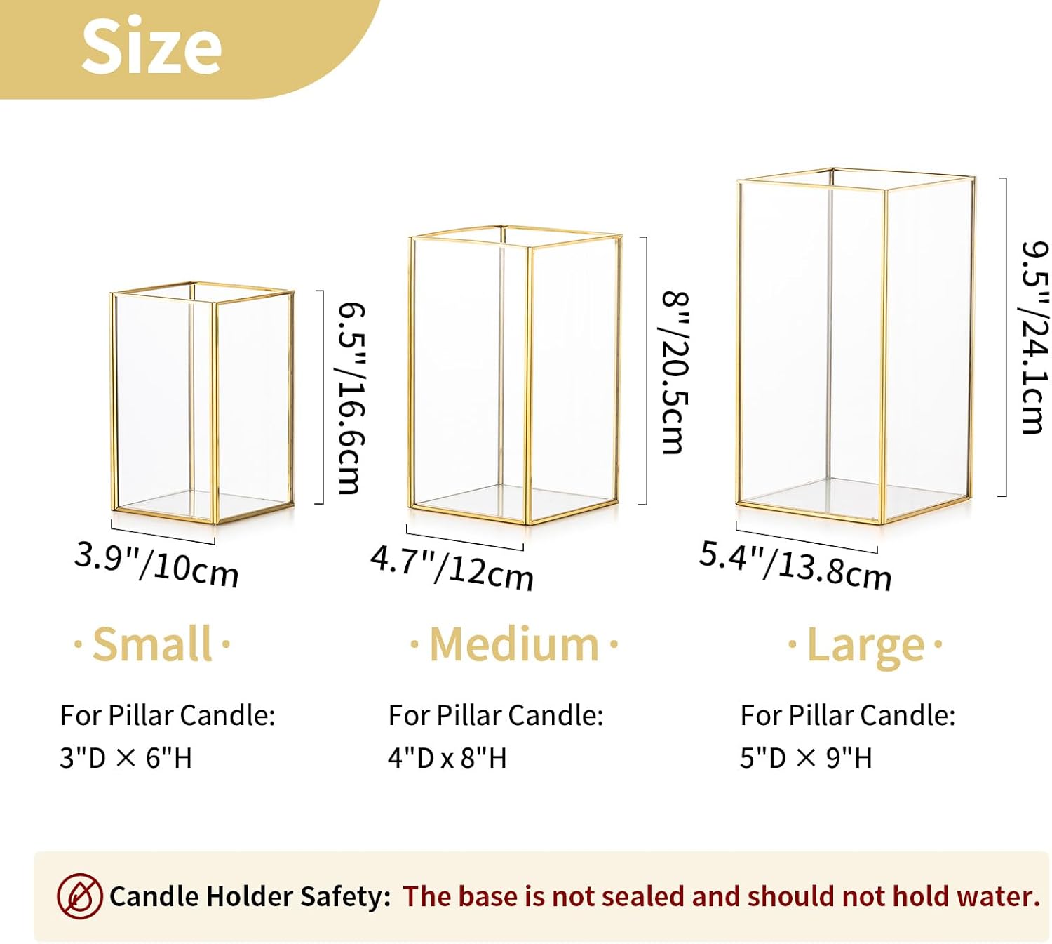 - 【Grösse】Sie erhalten 1 Set (3 Stück) von verschiedenen Grössen Glas rechteckige Kerzenhalter Set. (Blumen und Kerzen sind nicht enthalten.) Grosser Kerzenhalter: 24.1cm Höhe × 13.8cm Breite × 13.8cm Länge, Medium Kerzenhalter: 20.5cm Höhe ×