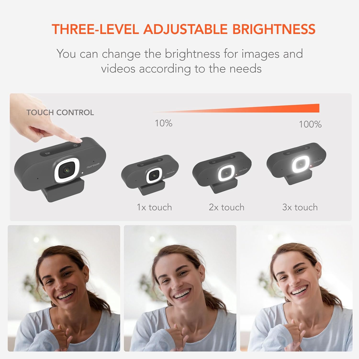 • 【Full HD Webkamera mit Ringlicht】Das 3-stufig verstellbare Ringllicht mit der Touch-Steuerung ermöglicht eine selbstdefinierte Einstellung von der Helligkeit, je nach dem Lichtverhältnis in dem Raum. Ideal für Videokonferenzen, Live-Streaming wie