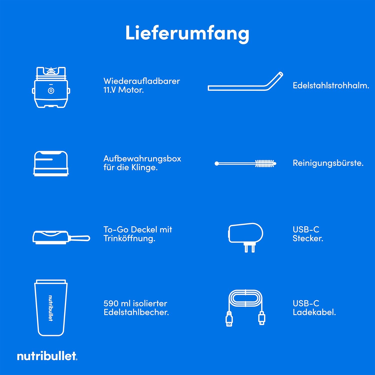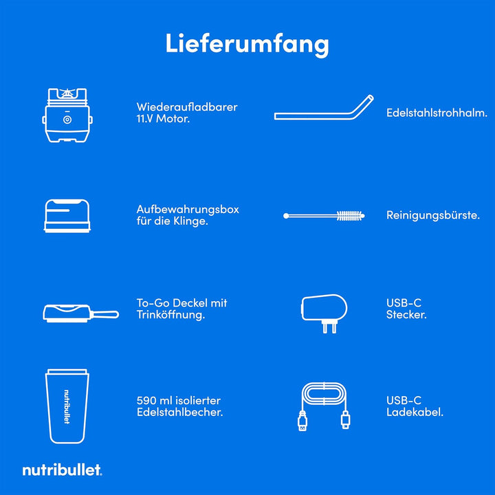 - [INKLUSIVE] Wiederaufladbarer 11,1-V-Motorblock, Transportdeckel mit Griff, Edelstahlklinge, isolierter Edelstahlbecher (590 ml), Deckel mit Trinköffnung und Strohhalm, Klingenabdeckung, Reinigungsbürste, Edelstahlstrohhalm und USB-C-Ladekabel