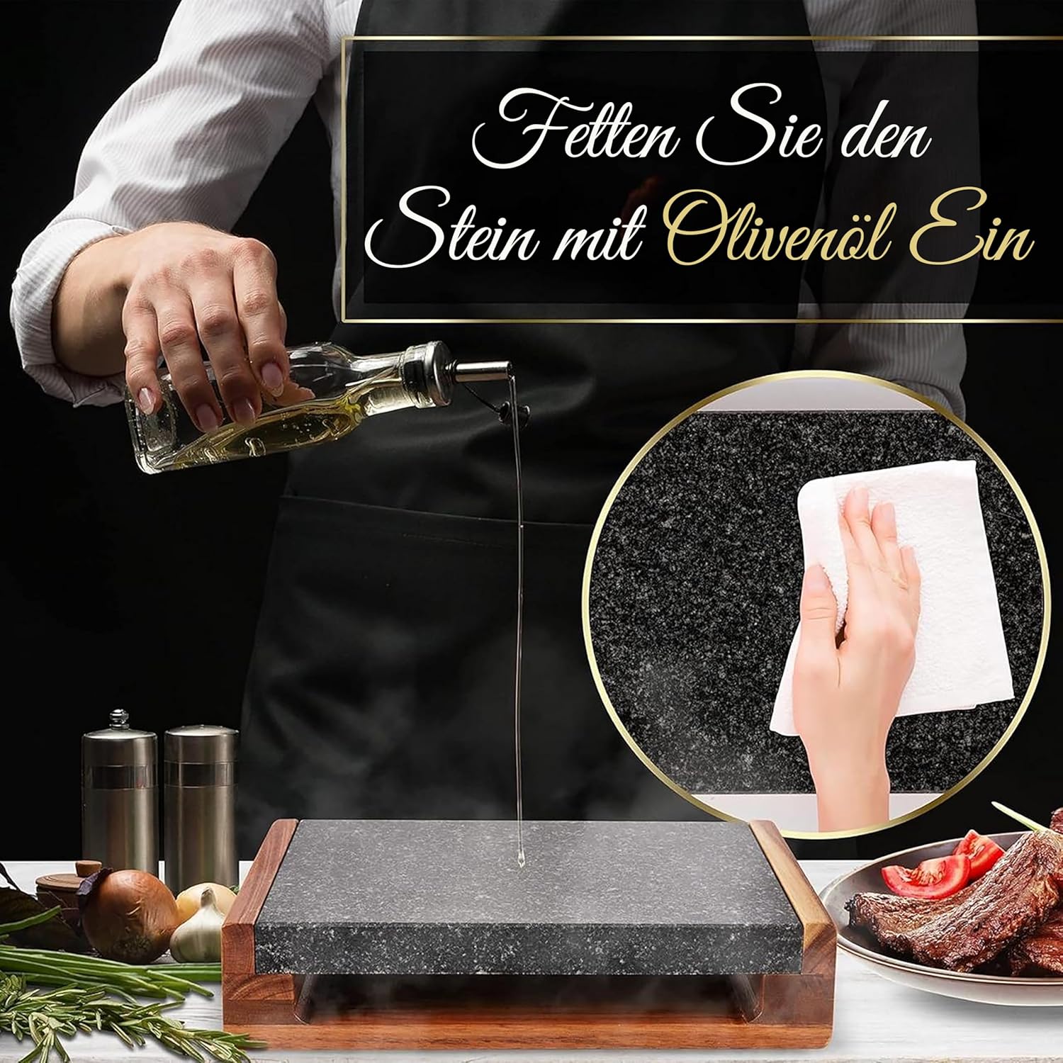 - DICKER UND ROBUSTER GRILLSTEIN: Der Heisser Stein hat die Masse 30 cm x 20 cm x 2,5 cm, was ihn schön dick macht, damit Ihr Steak gut darauf zur Geltung kommt. Das Tablett aus Akazienholz misst 33,5 cm x 20 cm x 7 cm.