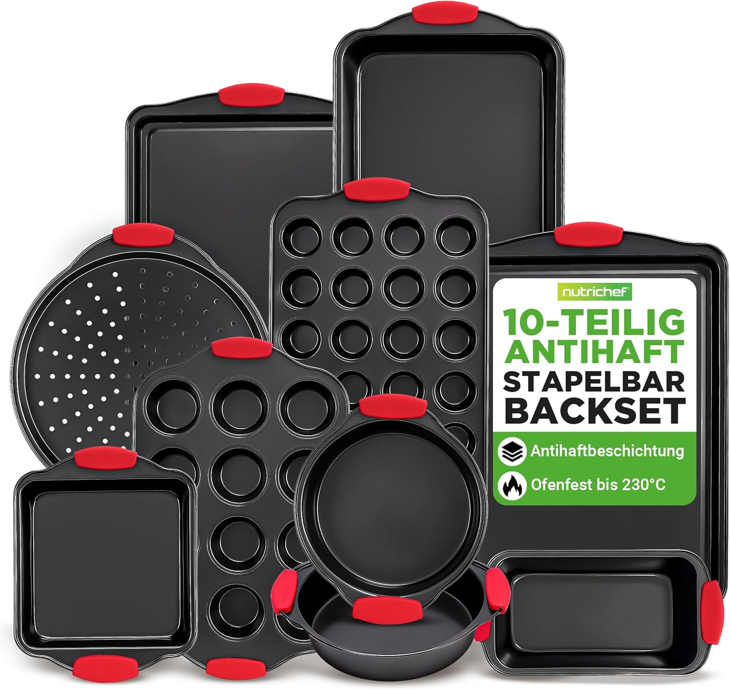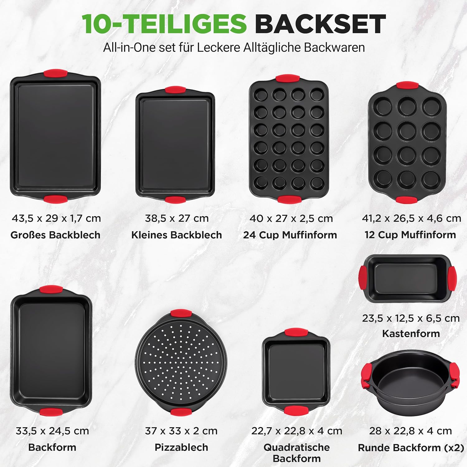 • 10-teiliges Set: Das 10-teilige Backformen-Set bietet komplett hochwertiges Küchenzubehör zum Backen von Kuchen, Brot oder Muffins. Inklusive Backform, Pizza-Pfanne, kleines Plätzchenblech, 2 runde Pfannen, quadratische Pfanne, Brotbackblech, 12 und