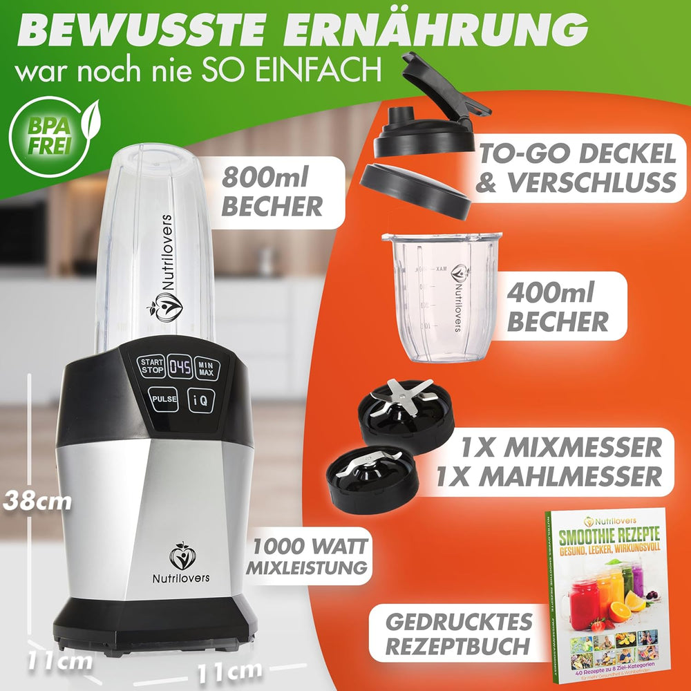 - β ππππππ π ππππ πππππππππ - 1000W (1.4 PS) β Nutrilovers Hochleistungsmixer mit 30.000 U/min. Kompakt und extrem kraftvoll. MΓΌhelose Zubereitung und cremig feine Konsistenzen fΓΌr eine