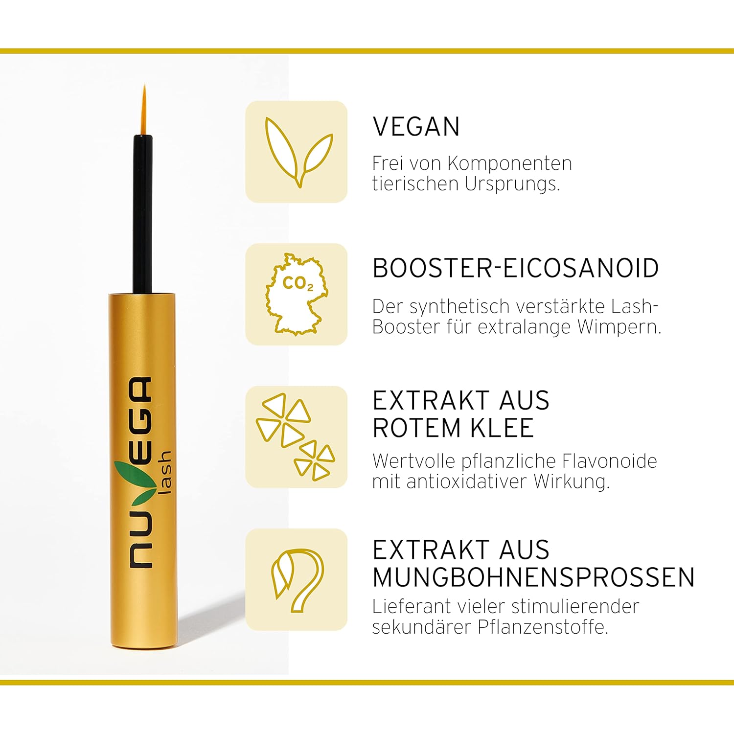- ATEMBERAUBENDES VOLUMEN: Die Kombination aus synthetisch optimiertem Nuvega-Eicosanoid, Bio-Peptide aus Rotem Klee und Stammzellen der Mungbohne stimulieren effektiv das Längenwachstum und sorgen für umwerfend voluminöse Wimpern