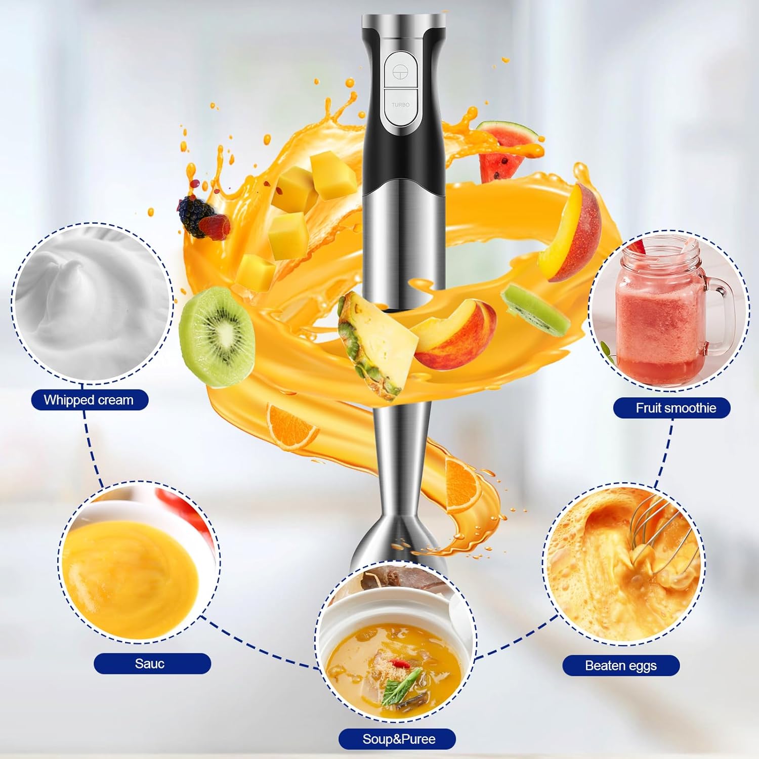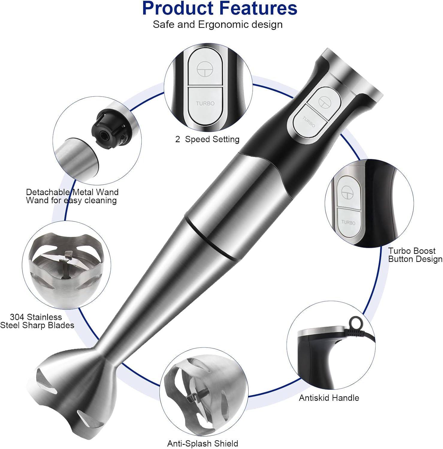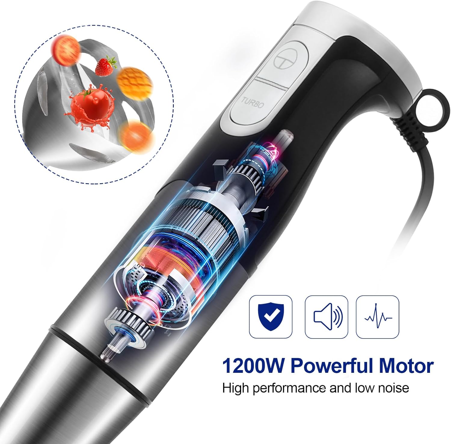 - 1200 W Leistung: Der 1200 W Motor ist leistungsstark und effizient, sodass Sie Lebensmittel in kurzer Zeit mischen können. Die scharfe Klinge kann schnell und einfach schneiden. Sein schlanker Rührstab bietet eine bessere Kontrolle und reduziert