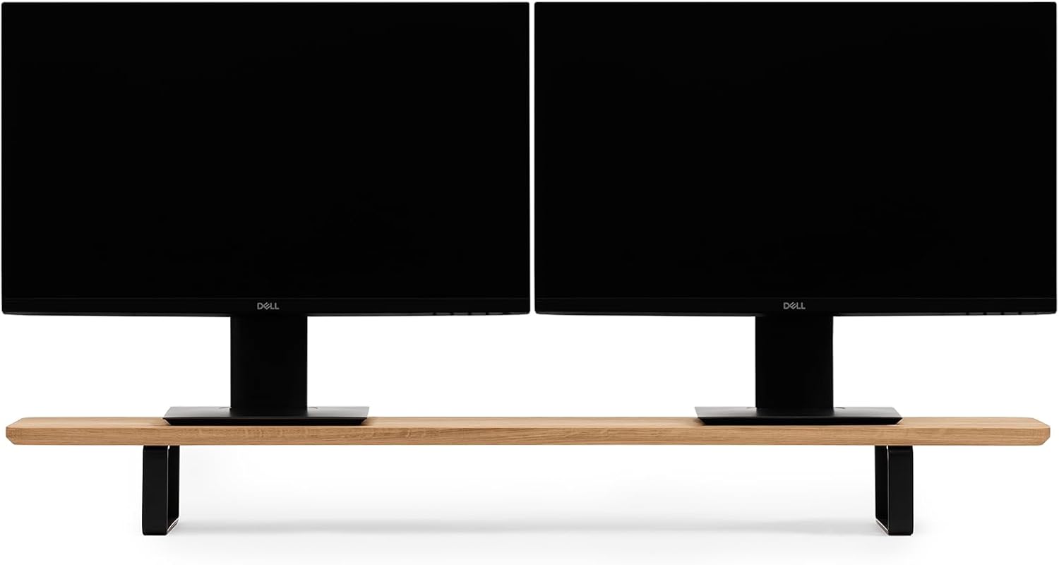 - Robust: Beim Kauf haben Sie die Wahl zwischen einer Monitorablage aus massiver Eiche oder Nussbaum. Die Stahlbeine sind mattschwarz pulverbeschichtet. Dank einer Korkauflage hinterlässt der Ständer keine Kratzer auf dem Schreibtisch