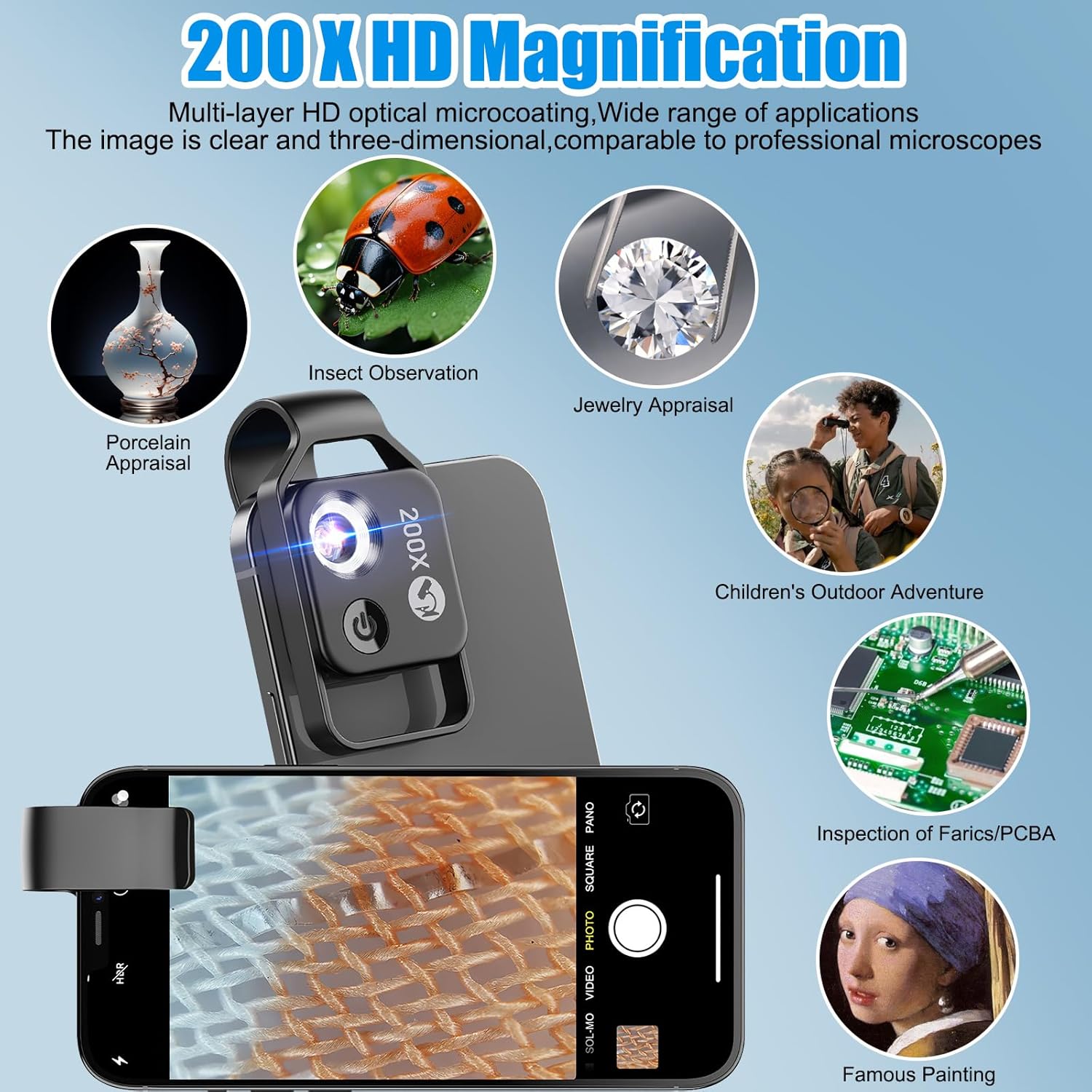• Einfach zu bedienen: Passen Sie das Handy-Klemmenmikroskop einfach an die Handykamera an und richten Sie es auf die Hauptkamera des Mobiltelefons. Es ist wichtig, nahe und parallel zur Oberfläche des Objekts zu fotografieren, um eine hohe Bildqualität