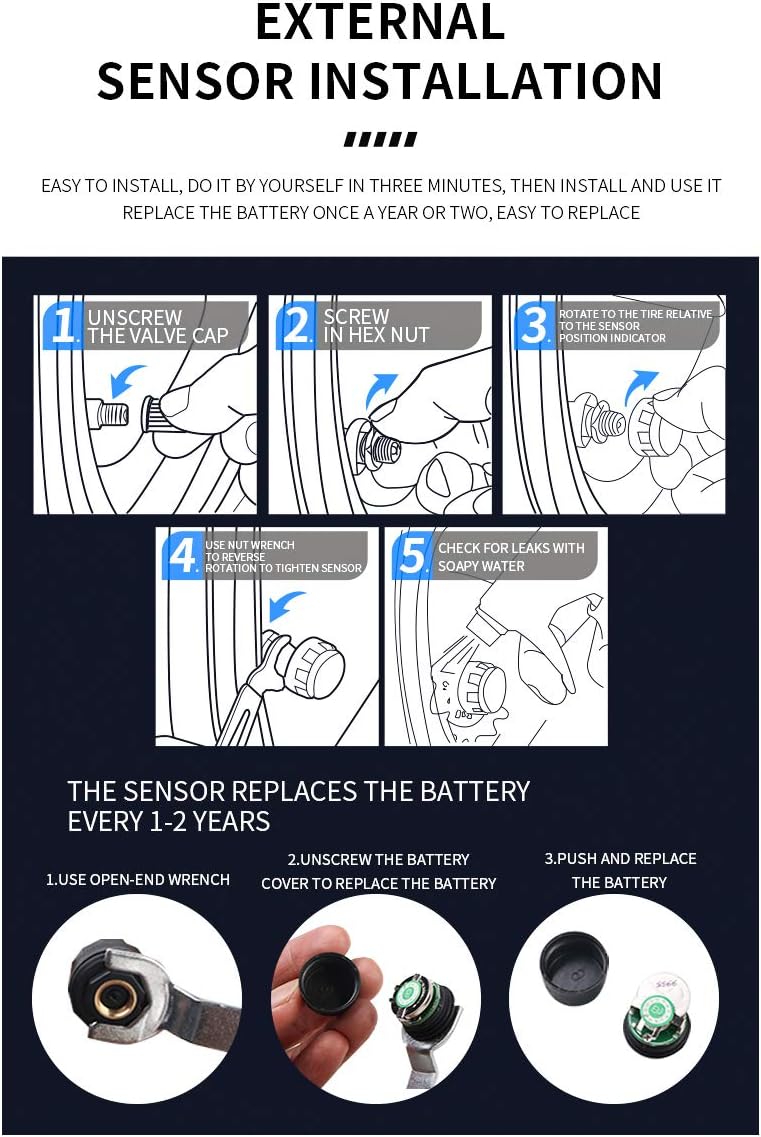 - 6 ALARMMODI: TPMS bietet 6 Alarmmodi (einschliesslich schneller Luftleckalarm, langsamer Luftleckalarm, Hochdruckalarm, Hochtemperaturalarm, Alarm bei schwacher Batterie und Sensorausfallalarm), um Ihre Fahrsicherheit zu gewährleisten.