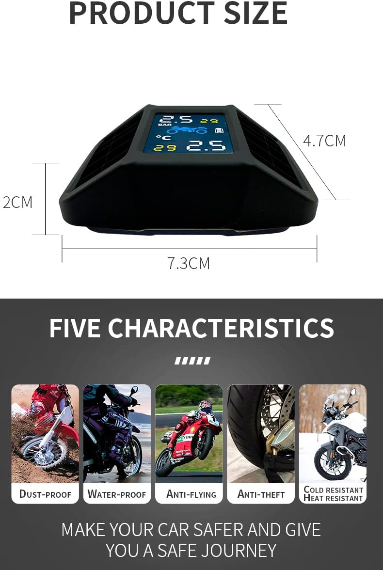 - DIGITALER LCD-BILDSCHIRM: Das Display zeigt gleichzeitig den Druck und die Temperatur der Vorder- und Hinterreifen in Echtzeit an, Sie können die Daten leicht ablesen. TPMS ist für Motorradreifen mit einem Druck unter 3,5 bar (51 pis) geeignet.