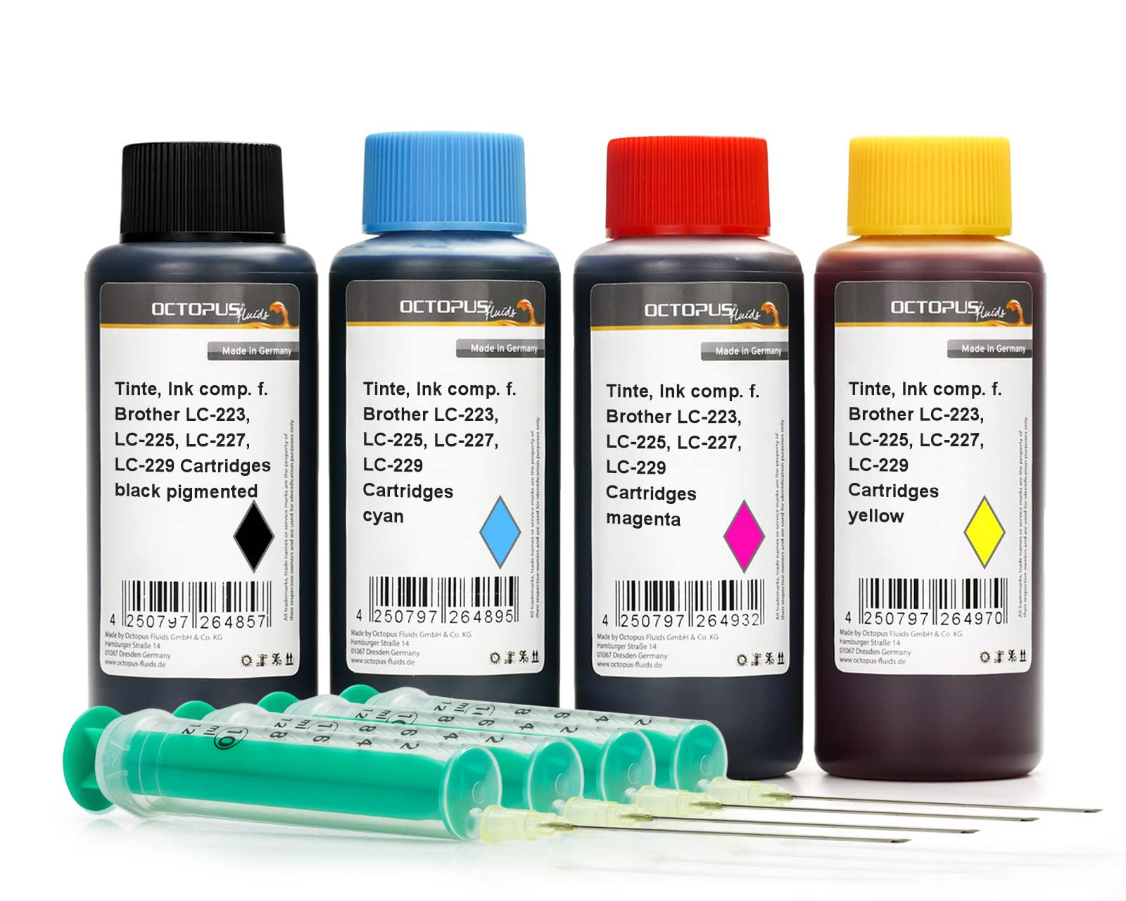 - PREMIUMTINTE 4 x 100 ml, speziell für Brother LC-223, LC-225, LC-227, LC-229 entwickelte Druckertinte !!!keine Universaltinte!!! Geniessen Sie die farbliche Ausdruckskraft des Originals.