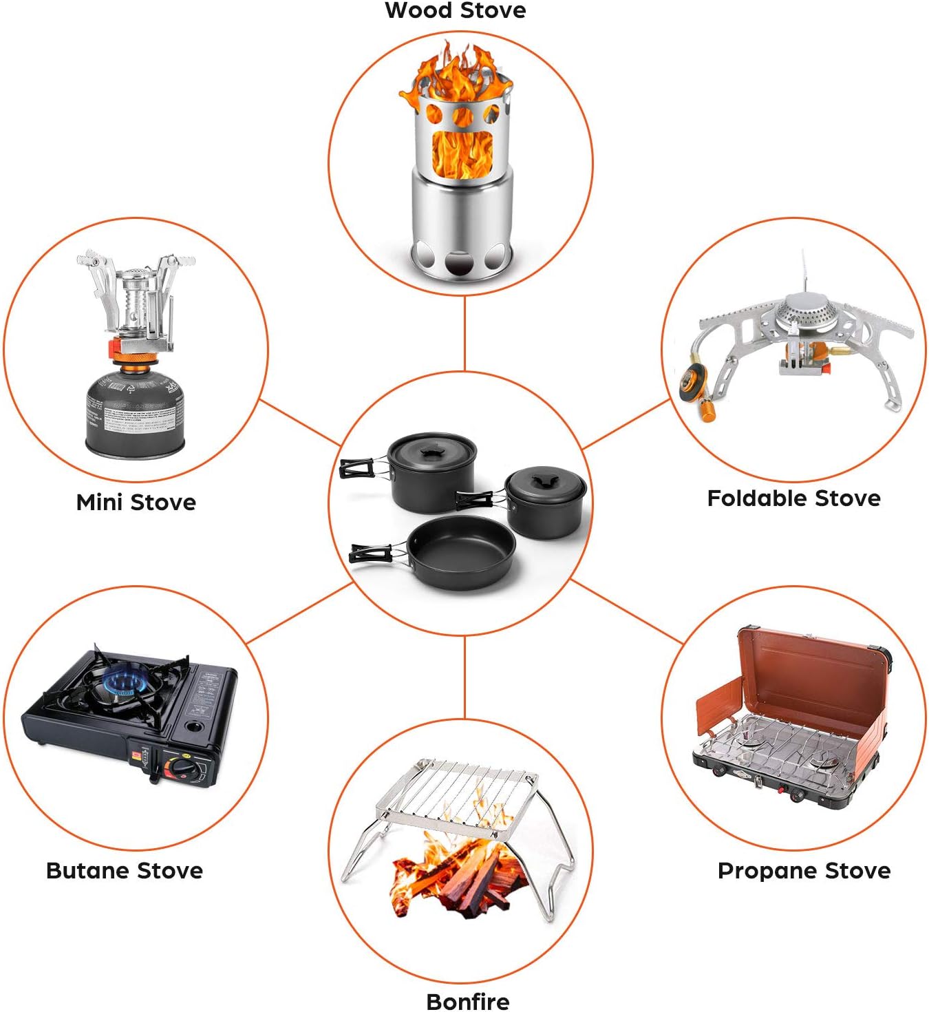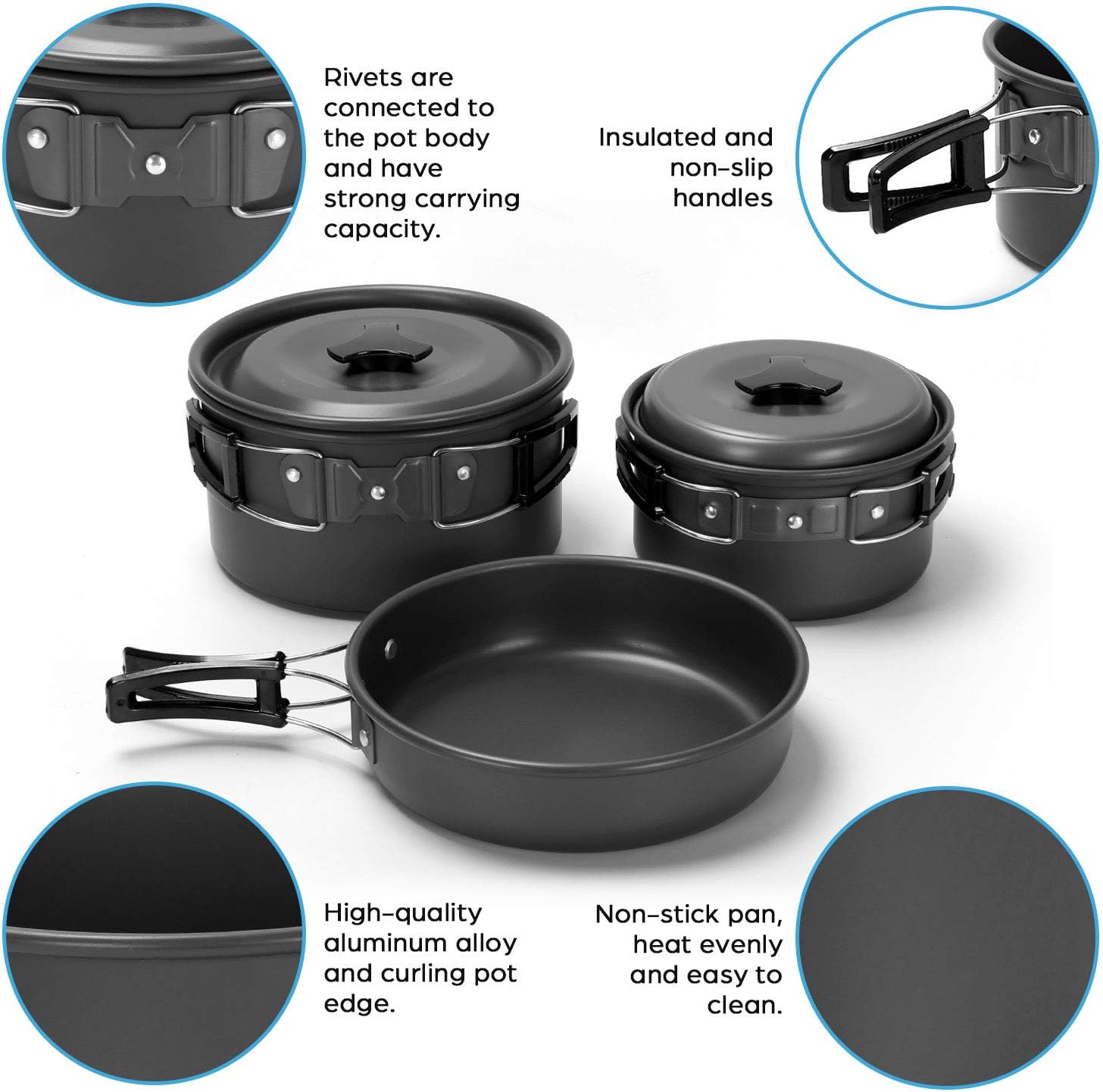 - 【Camping Kochset 】 - Das 16-teilige Camping-Kochgeschirr-Set enthält 1 x L-Töpf, 1 x S-Topf, 1 x Pfanne, 1x campingkocher, 2 x 230 ml Edelstahlbecher mit Silikonschutz, 2 x 16 cm Edelstahlplatten, 2 Sätze Geschirr für das Abendessen (2 x Gabeln,
