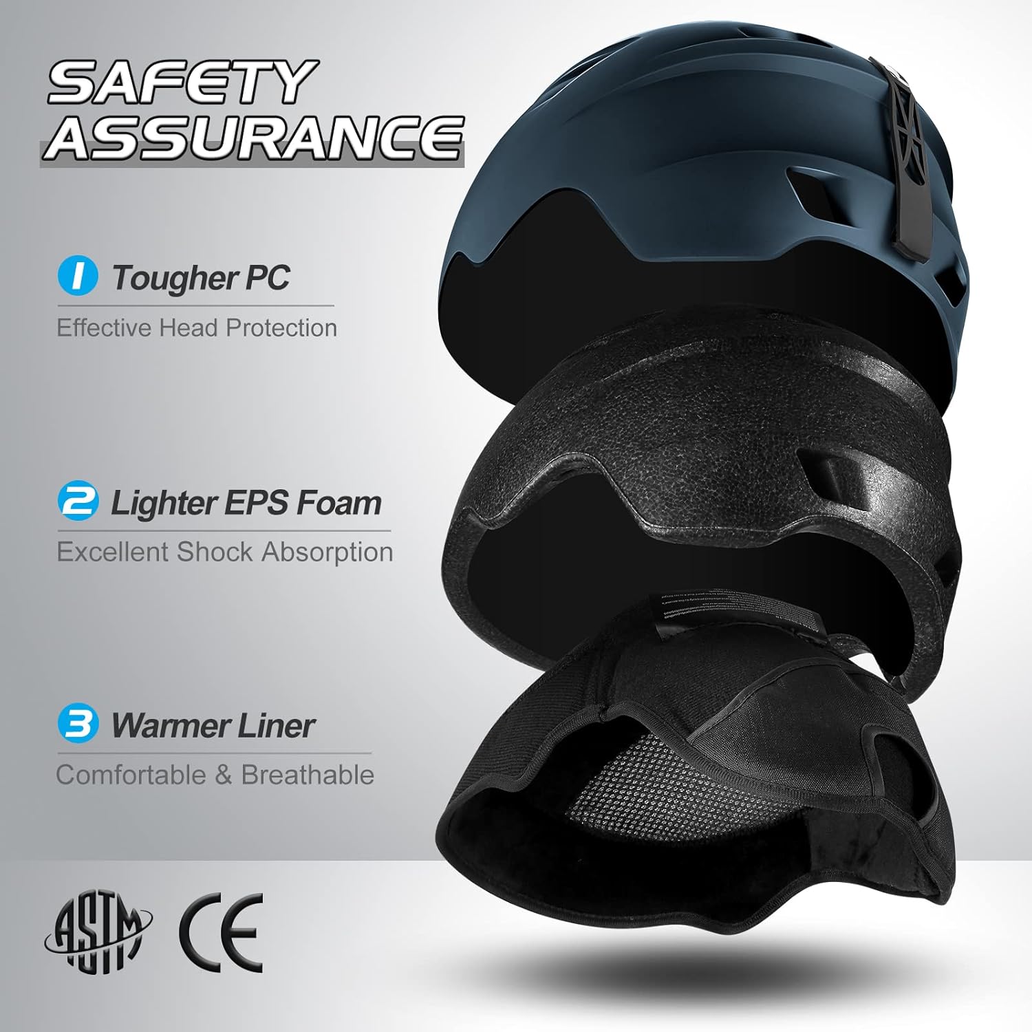 - ☃【FLEXIBEL & KOMFORTABEL】 Der Skihelm ist mit abnehmbarem Futter, abnehmbarem Ohrenschützer und weichem Kinnriemen für warmes Tragen ausgestattet. Beide lassen sich leicht einstellen, an- und abnehmen. Sie sind leicht, Sie haben weniger Druck auf