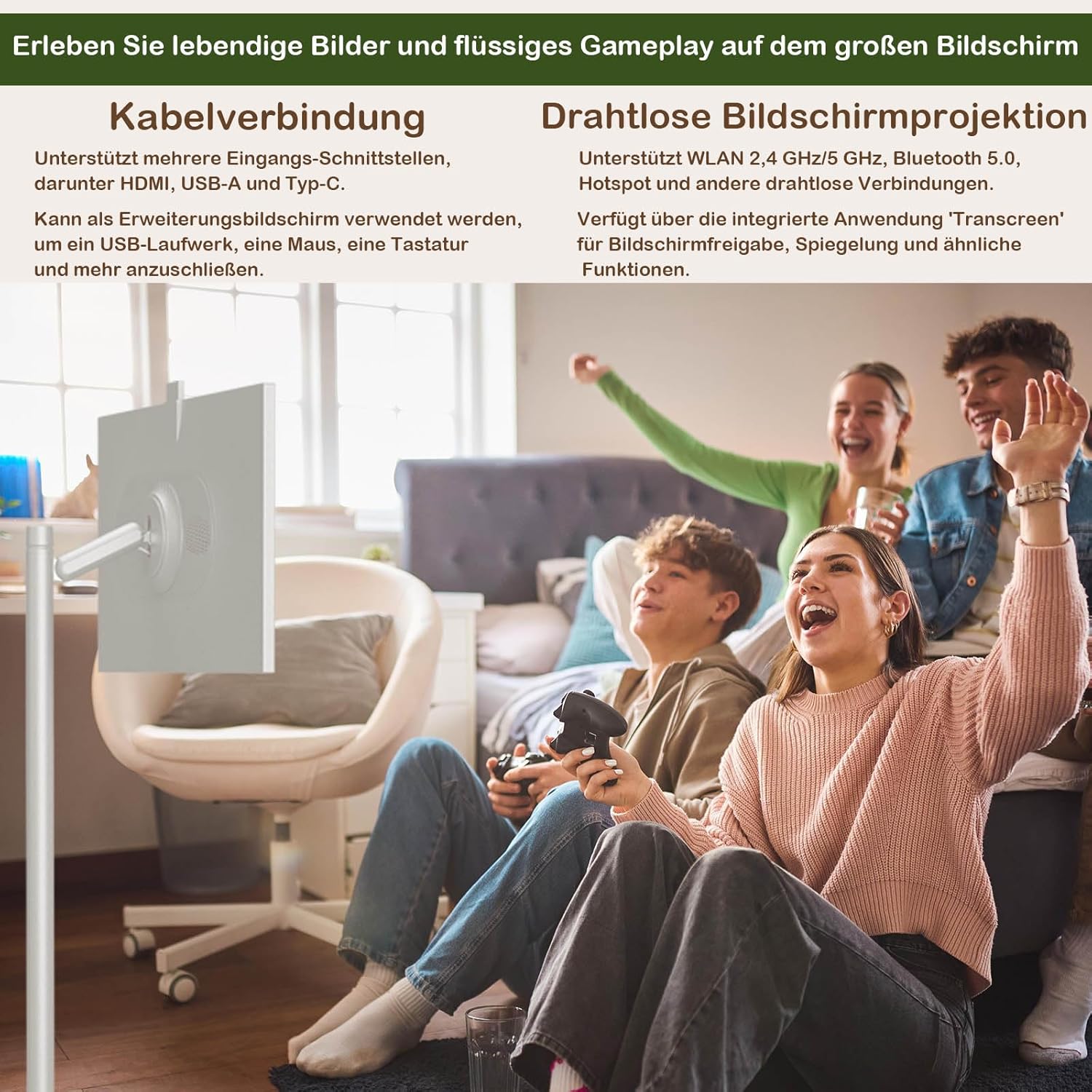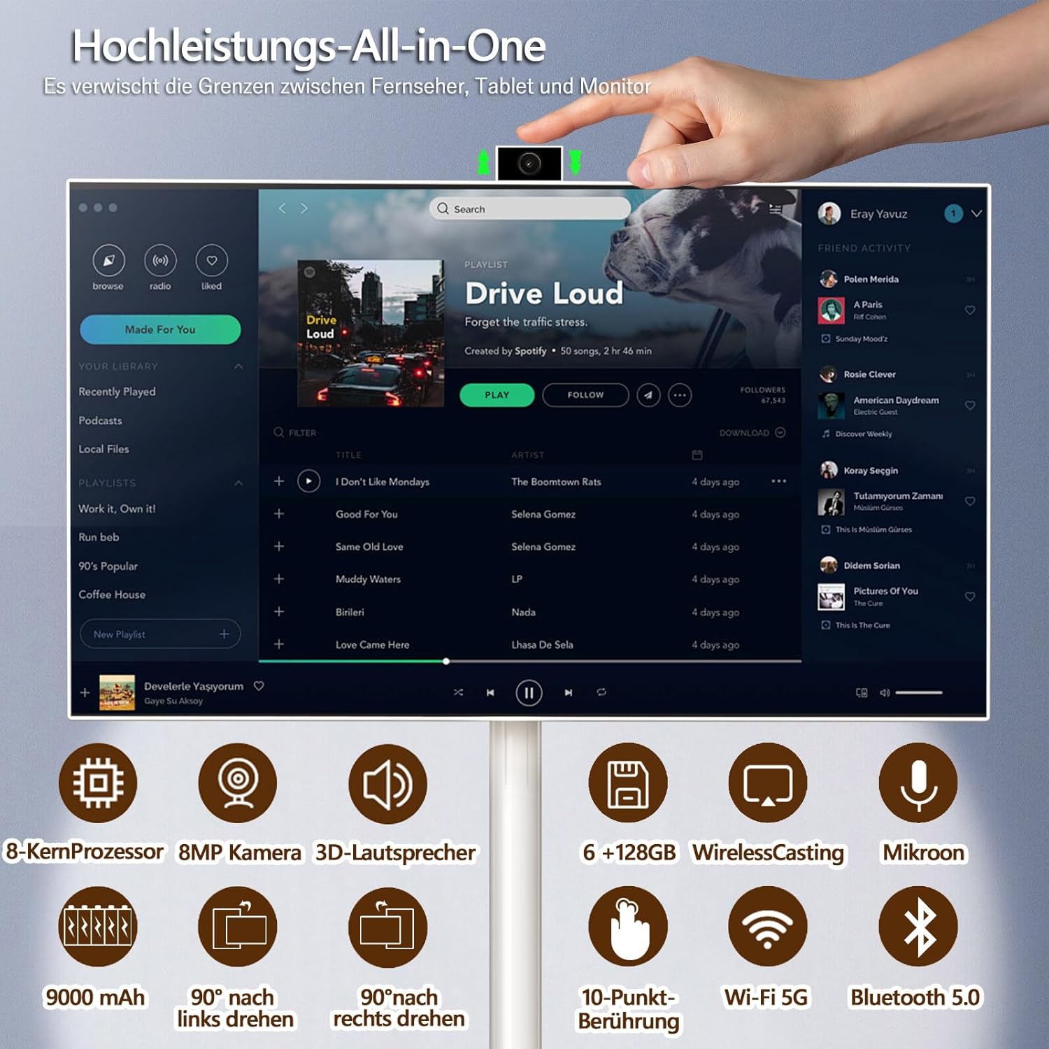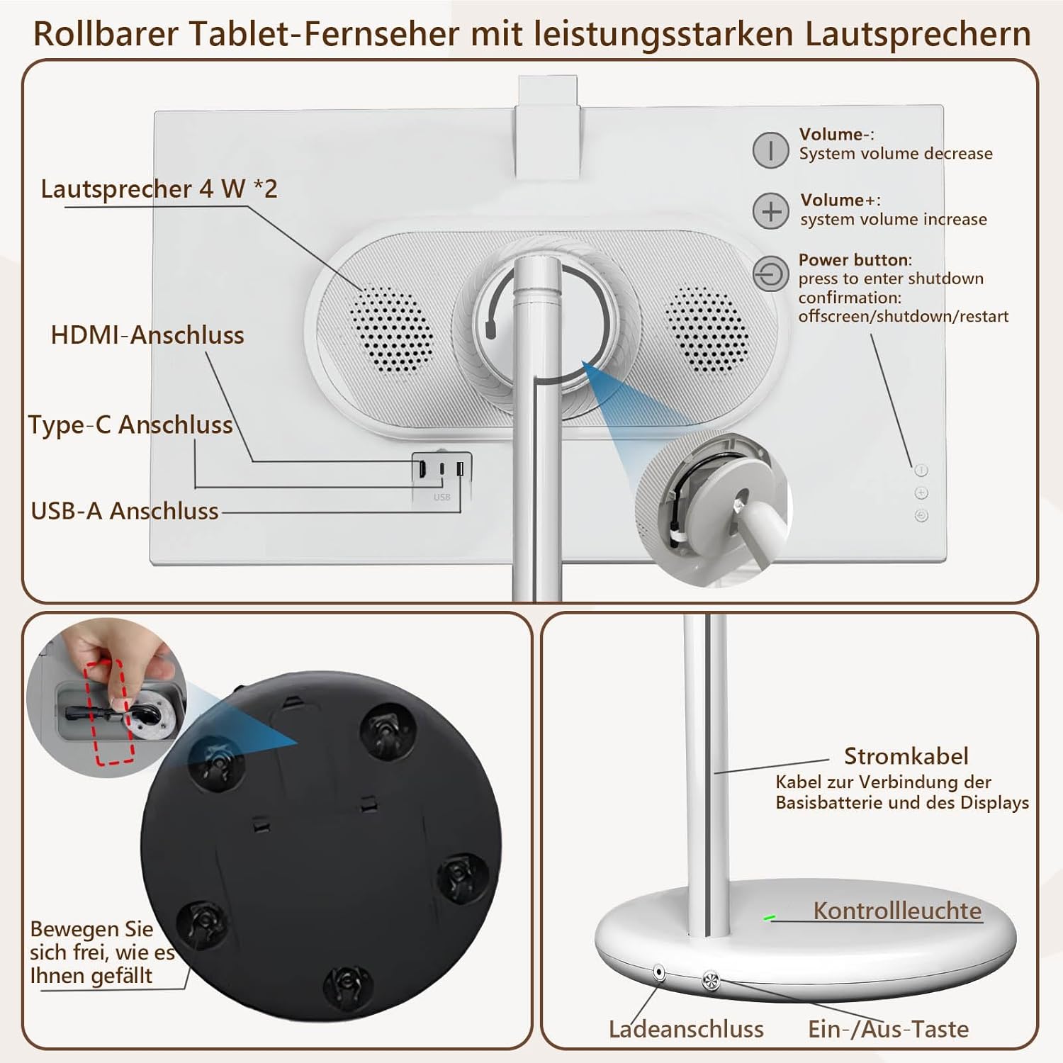 - 【Lange Akkulaufzeit, Flexibles Seherlebnis】Der integrierte Akku des Smart Portable TV bietet 6–8 Stunden ununterbrochene Nutzung. Der Touchscreen kann geneigt, gedreht, geschwenkt oder in der Höhe verstellt werden, um aus jeder Position – im