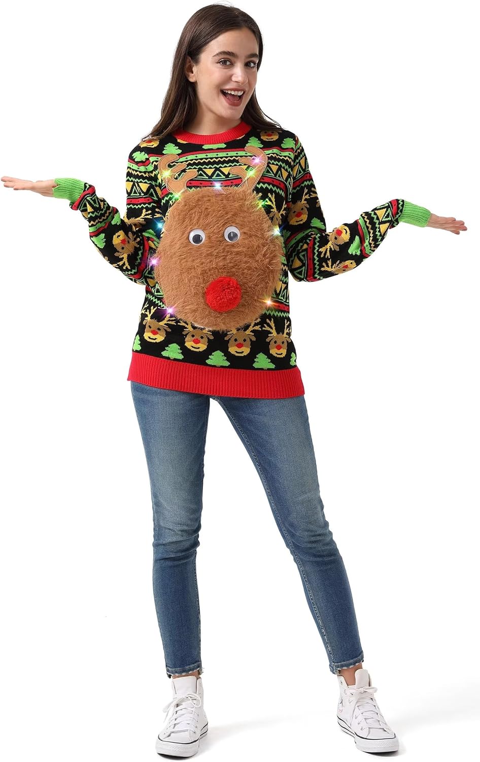 - Warmer, tragbarer Acryl-Komfort. Gestrickt mit hochwertigem Acryl, das weich und nicht kratzt, wurde unser hässlicher lustiger LED-Weihnachtspullover für Komfort geschaffen, entworfen für Stil. Leicht und atmungsaktiv hält unser weihnachtliche