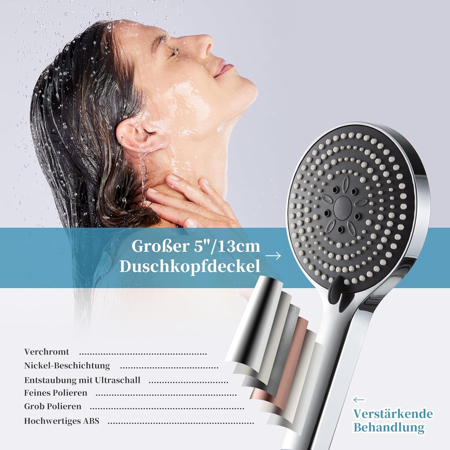- [Duschkopf Gross] Der Duschkopf hat einen Durchmesser von 130 mm, was den Erfassungsbereich vergrössert und Ihnen ein angenehmes Duscherlebnis ermöglicht. Er ist ideal, um Shampoo schnell und gründlich abzuspülen.
