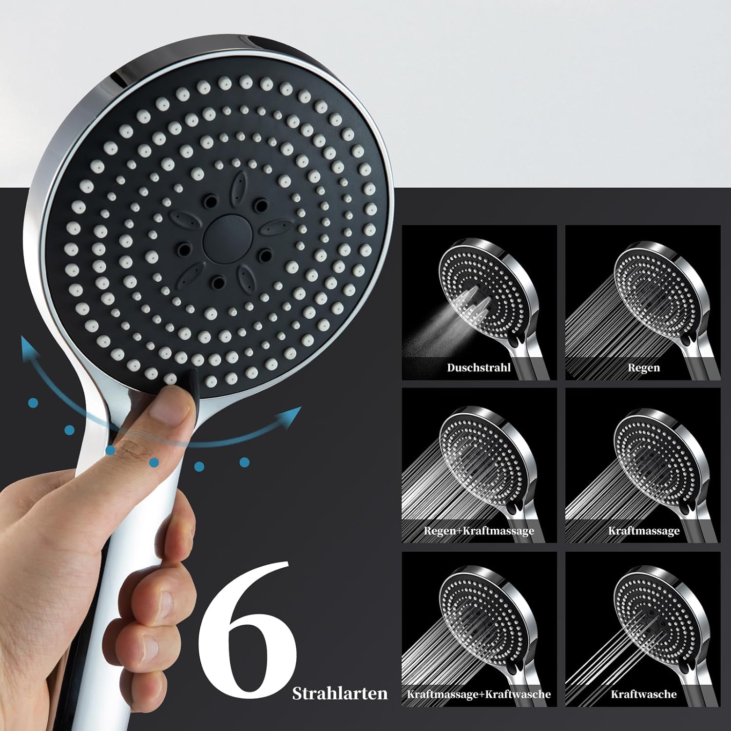 - [6 Strahlarten Shower Head] Die Duschkopf kommt mit 6 Strahlarten. Sie können die Modi mit einem Tastendruck wechseln. Jeder Modus bietet Ihnen ein wunderbares Duscherlebnis.