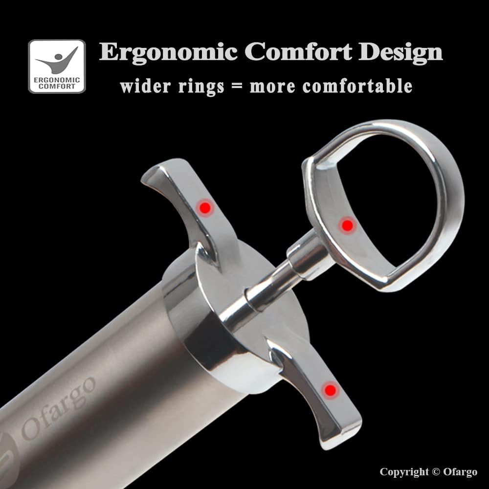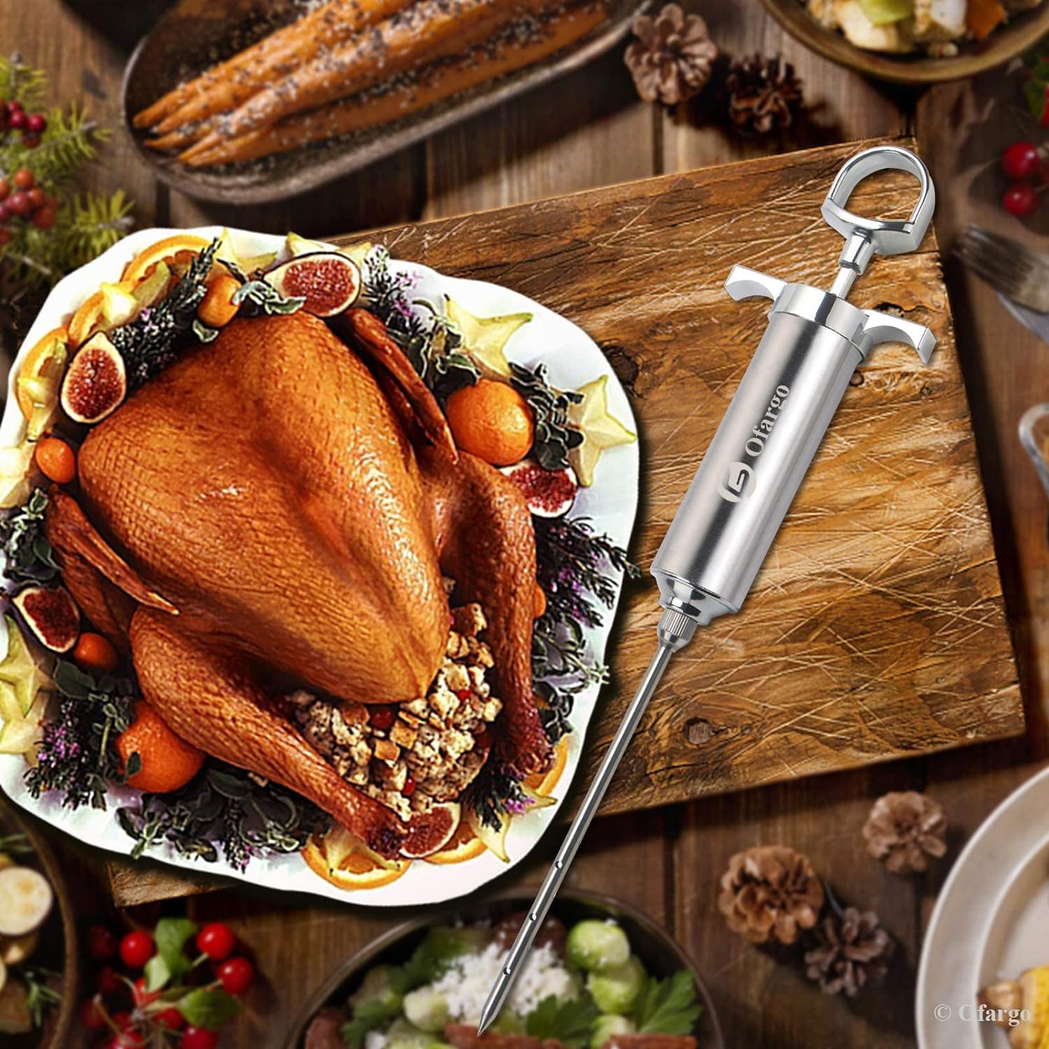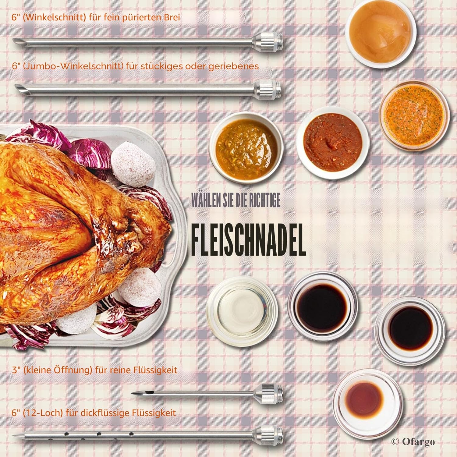 - Einfach zu bedienen und spülmaschinenfest: Ergonomisches Gewinde-Design, einfach zusammenzubauen oder auseinanderzunehmen. Der Spritzenkörper mit 59 ml Fassungsvermögen minimiert den Bedarf an Nachfüllungen; der Griff mit drei Ringen bietet einen komfortablen Halt und einfache Druckkontrolle; 4 austauschbare Truthahnnadeln mit mehreren Löchern für tiefes Eindringen und perfekte Sossenverteilung, wie dickflüssige Marinaden oder Salzlauge.
