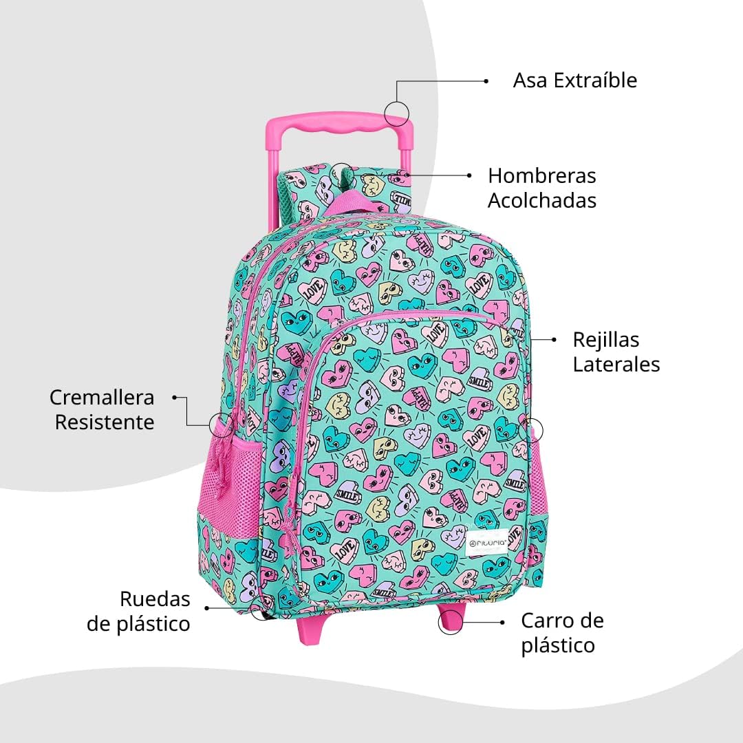 PRODUKTBESCHREIBUNGEN Schulrucksack für Kinder mit kompaktem Trolley mit abnehmbarem Griff, bestehend aus einer Fronttasche und einem grossen Reissverschlussfach. Ideal als Schul- und Reiserucksack - Ofituria Mehr