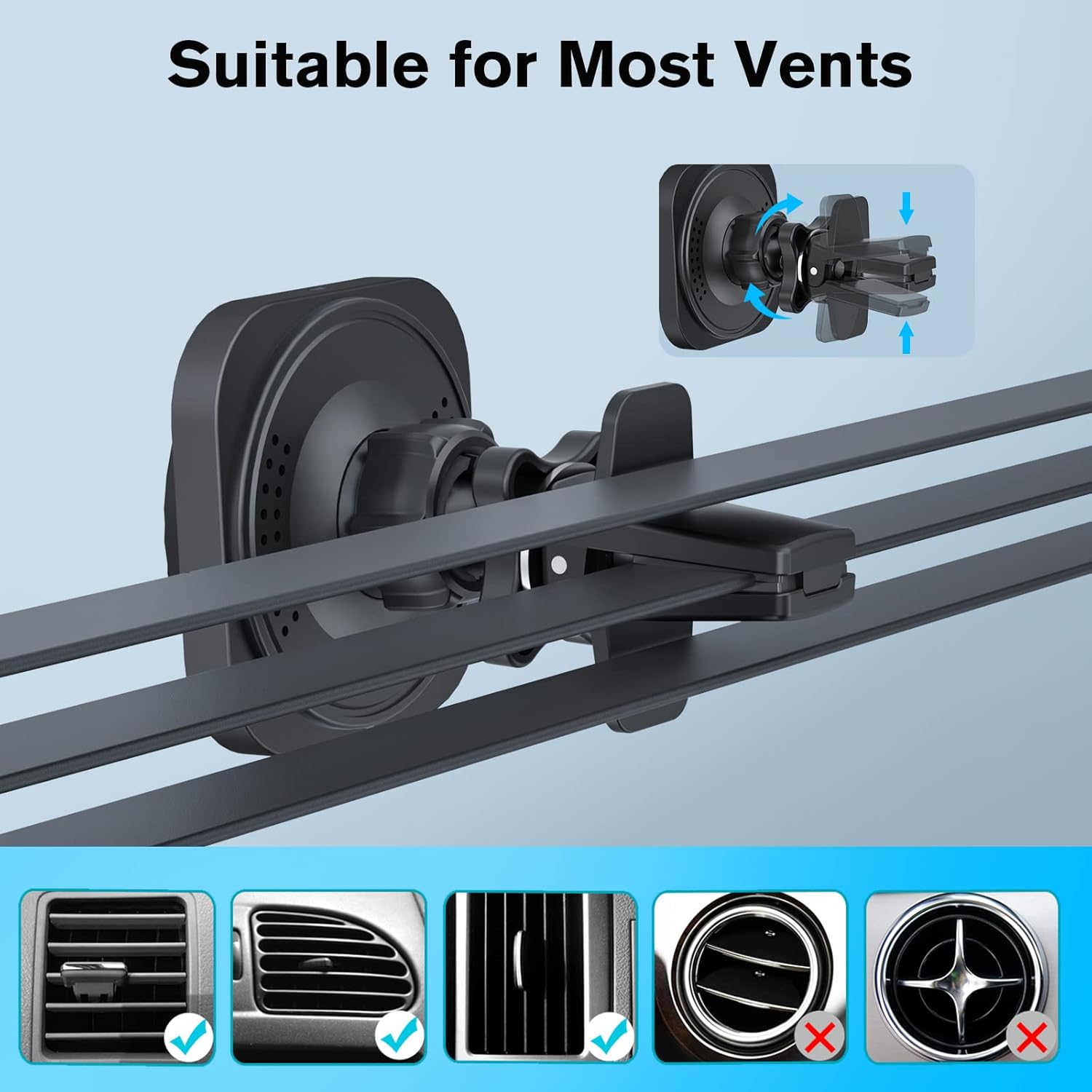 - Mehrere Montagemöglichkeiten: Die Für Magsafe Autohalterung mit Ladefunktion ist in zwei Montagemöglichkeiten erhältlich – Lüftungsclip und 3M-Klebesockel. Auf der Innenseite des Lüftungsclips ist hochwertiger Gummi aufgeklebt, der ein