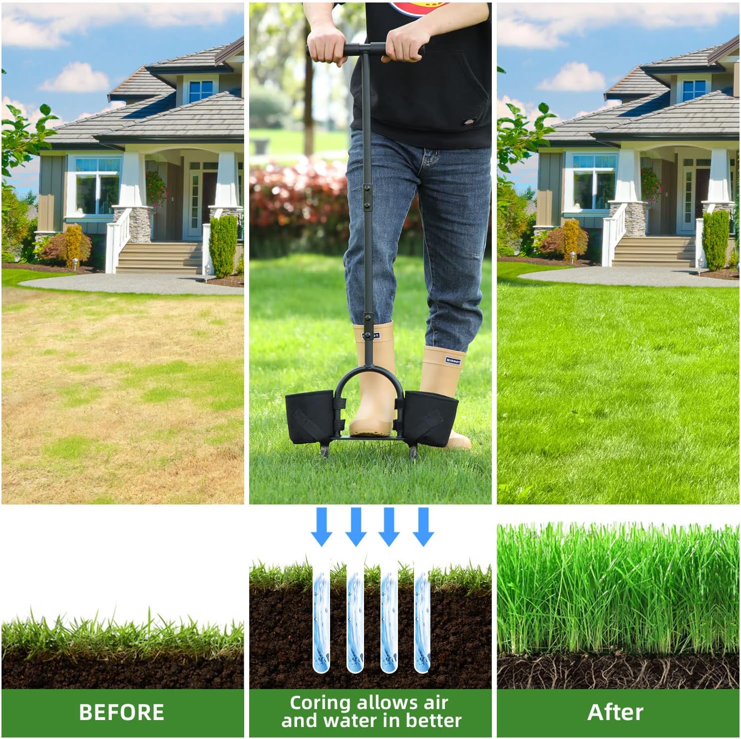 - Tieferes Eindringen: Je tiefer, desto besser! Dieser manuelle Pfropfenbelüfter entfernt mit einer einfachen Schrittbewegung jeweils längere Pfropfen aus dem Boden und schafft so tiefere Kanäle, durch die Sauerstoff, Wasser und Nährstoffe in den Boden