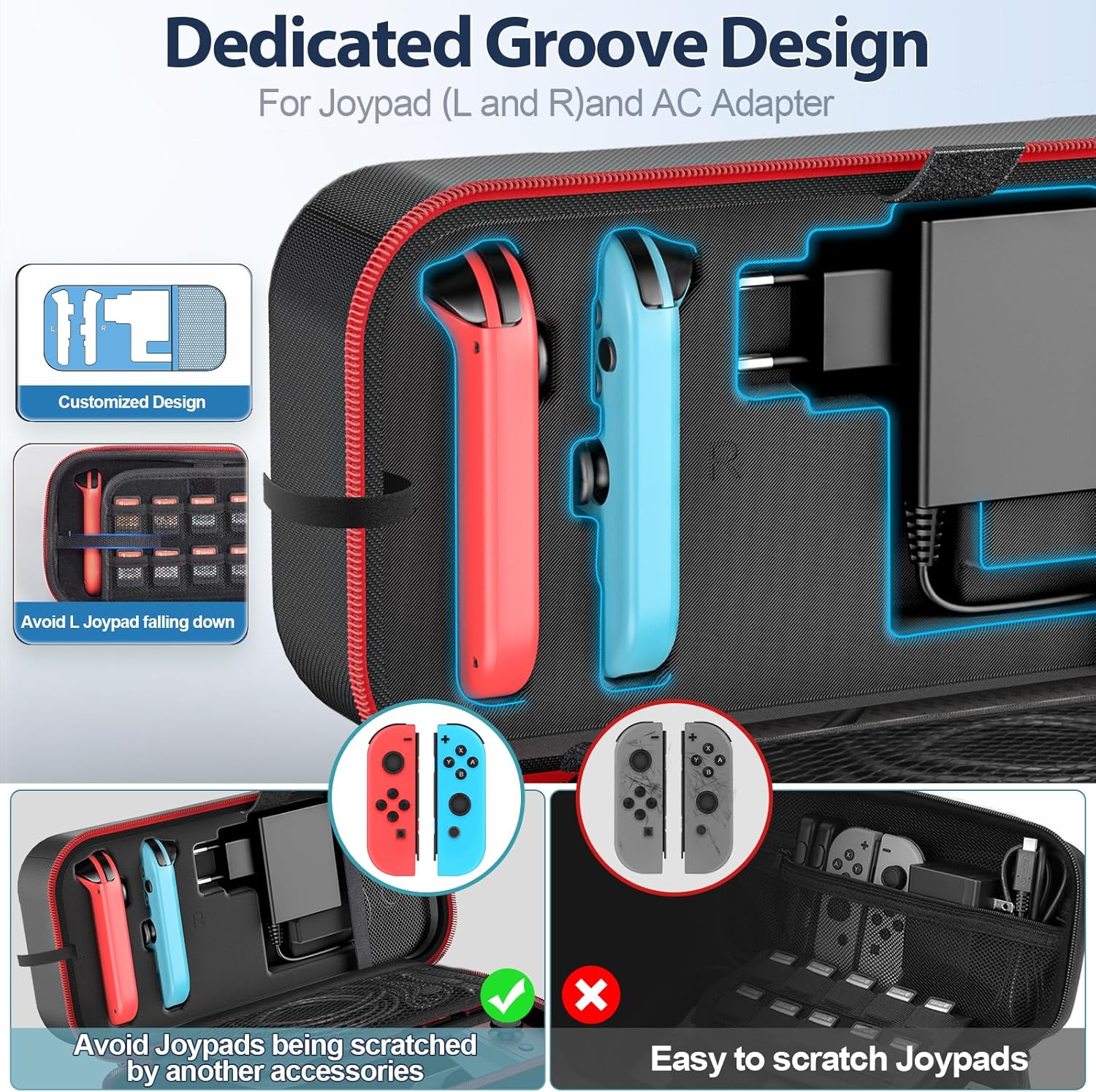 - 【Grossraum für Aufbewahrung】Das Switch OLED Tasche ist ideal für unterwegs. Es gibt grossen Aufbewahrungsraum, Sie können die notwendige Switch Zubehören darin setzen. Es gibt noch genaue Platzierung der beide Switch Joy Cons und EU Netzteil.