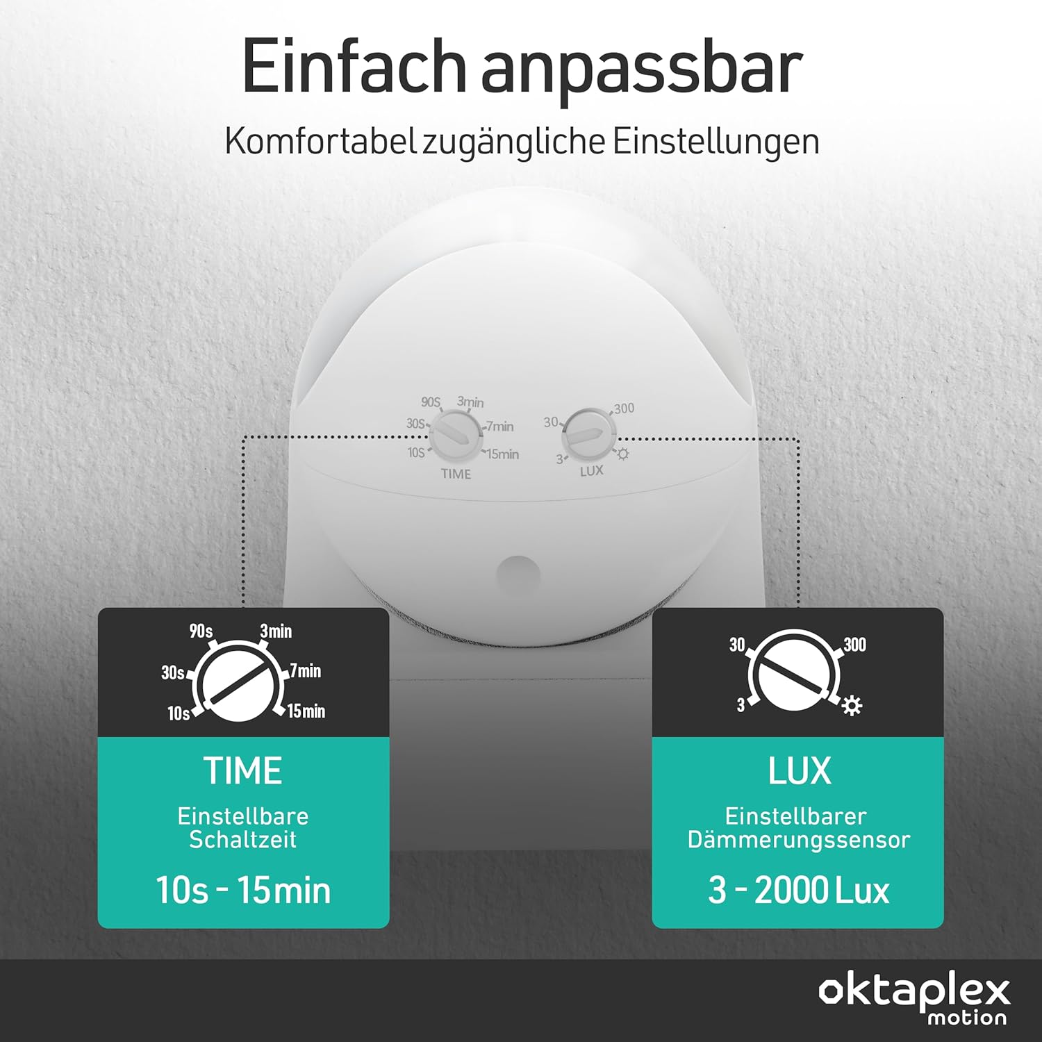 - Bewegungssensor mit stufenlos einstellbarer Schaltzeit (10 Sekunden - 15 Minuten) und integrierten Dämmerungssensor (3 - 2000 Lux).