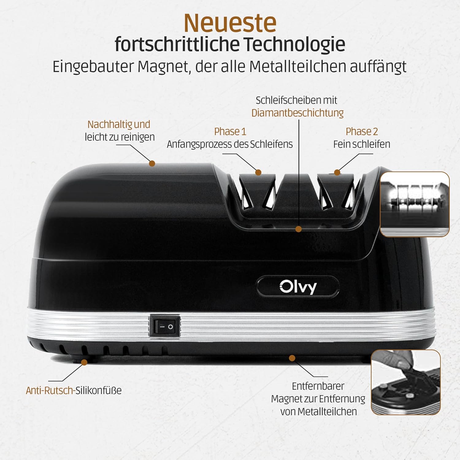 - Schnelles und effizientes Schärfen: Dank des fortschrittlichen zweiphasigen Schärfprozesses werden deine Messer im Handumdrehen scharf, sodass du schnell und effizient perfekt geschärfte Messer geniessen kannst.