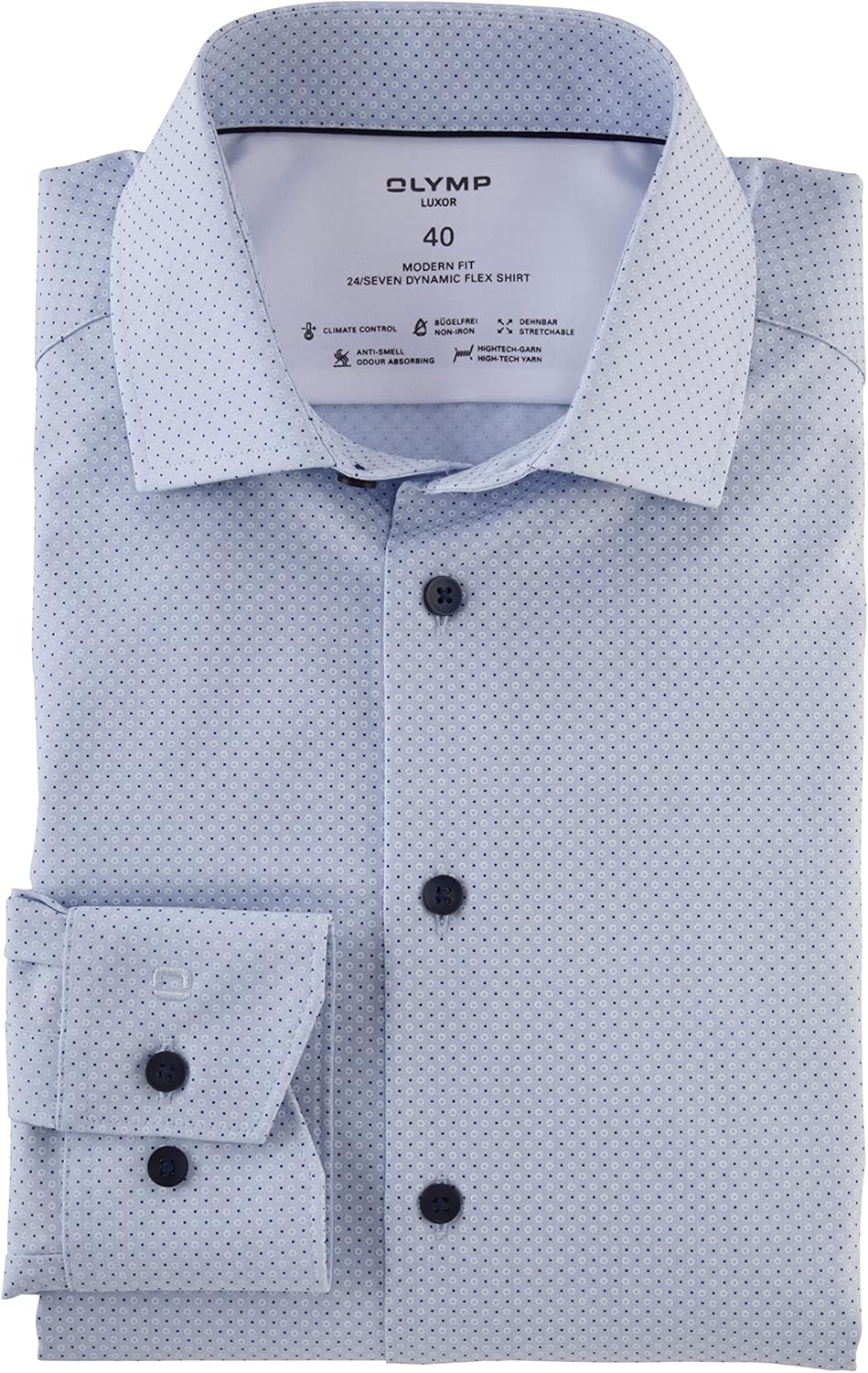 - OLYMP Luxor 24/Seven mirdern fit GREEN CHOICE Hemd Langarm Langarmhemd Herrenhemd Funktionshemd Ökohemd Biohemd Sommerhemd Temperaturregelndes Hemd Hemd gegen viel schwitzten kühlendes Hemd Muster hellblau