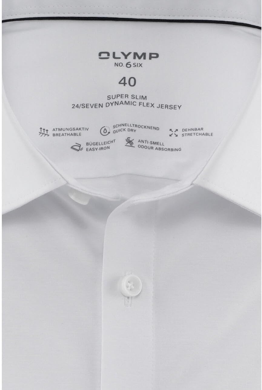 PRODUKTBESCHREIBUNGEN Dynamic Flex Jersey. Das OLYMP No. Six 24/Seven super slim Hemd ist ausgestattet mit einem modischen Muster, mit einem Haifischkragen und Kombimanschetten. Einen hohen Tragekomfort bieten die Stretch-Baumwolle-Qualität und der stark taillierte Schnitt. Kragenhöhe ca. 4 cm, Ärmellänge 67 cm