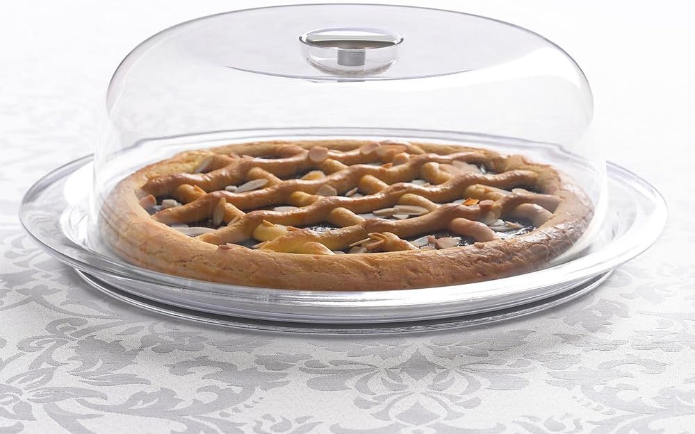- Geeignet für 25 cm Kuchen; Aussenmasse 33 cm (Durchmesser) x 12 (Höhe); Tablett mit kratzfester Innenseite und bequem im Kühlschrank mit der Frischeschutzglocke aufzubewahren